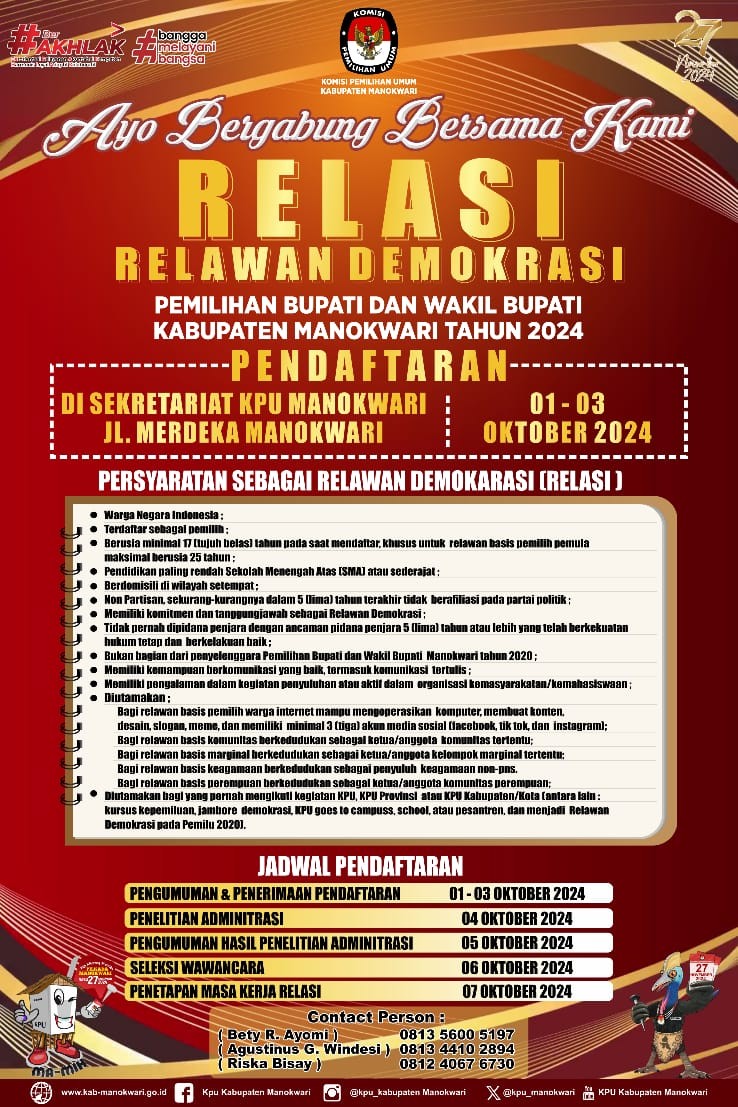 #PaceMace #TemanPemilih, KPU Kabupaten Manokwari membuka pendaftaran untuk bergabung menjadi Relawan Demokrasi Pilkada 2024. Pengumuman resmi, Informasi dan Pendaftaran di Kantor KPU Kab. Manokwari. #kpumelayani #pilkadaserentak2024 ....