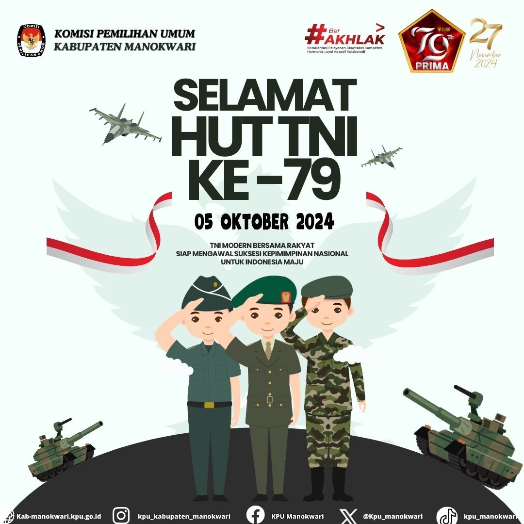 #PaceMace #TemanPemilih, seluruh jajaran KPU Kabupaten Manokwari mengucapkan Dirgahayu TNI ke-79, 5 Oktober 2024. “TNI Modern Bersama Rakyat Siap Mengawal Suksesi Kepemimpinan Nasional Untuk Indonesia Maju” #KPUMelayani #pilkadaserentak2024....