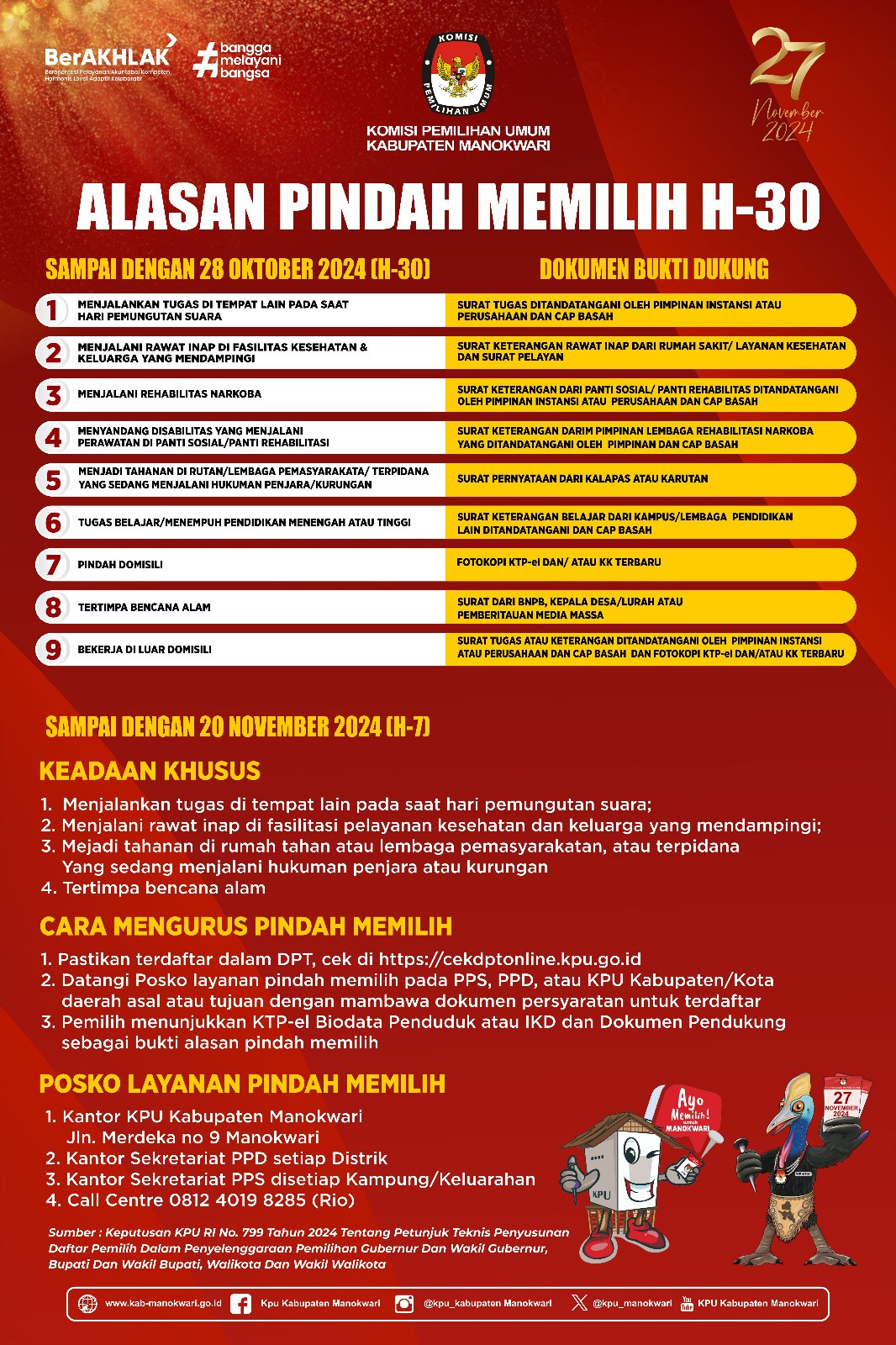 #PaceMace #TemanPemilih, dalam rangka optimalisasi pelayanan Pindah Memilih (DPTb), Komisi Pemilihan Umum Kabupaten Manokwari membuka pelayanan Pindah Memilih.. Bagi kalian yang terdaftar dalam DPT dan ingin pindah memilih dapat mengurus Pindah Memilih melalui petugas di kantor KPU Kabupaten Manokwari dengan membawa dokumen bukti dukung sesuai alasan pindah memilih. #KPUMelayani #PilkadaSerentak2024....