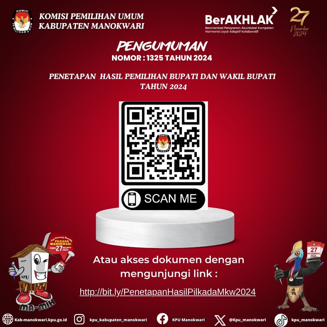 KPU Kab. Manokwari pada Jumat, 6 Desember 2024 bertempat di Aula Kantor KPU Kabupaten Manokwari telah melaksanakan Rapat Pleno Rekapitulasi Hasil Penghitungan Perolehan Suara dan Penetapan Hasil Pemilihan Bupati dan Wakil Bupati Manokwari Tahun 2024. Berdasarkan berita acara dan sertifikat rekapitulasi hasil penghitungan perolehan suara pada Pemilihan Bupati dan Wakil Bupati Manokwari Tahun 2024, KPU Kab. Manokwari menetapkan hasil Pemilihan Bupati dan Wakil Bupati Manokwari Tahun 2024 sebagai berikut: klik di sini....