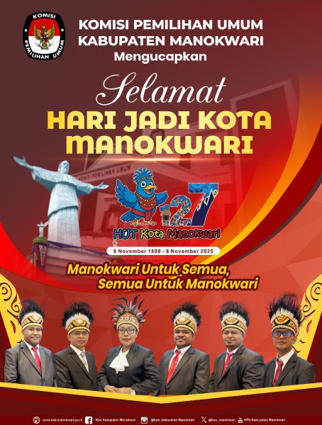 Atas nama Komisi Pemilihan Umum Kabupaten Manokwari, kami menyampaikan ucapan selamat kepada seluruh masyarakat Kota Manokwari. Momentum hari jadi yang ke-127 ini menjadi kesempatan bagi kita semua untuk memperkuat komitmen dalam merawat persatuan, menjaga nilai-nilai demokrasi, serta membangun Manokwari sebagai rumah bersama. Dengan semangat "Manokwari untuk Semua, Semua untuk Manokwari", mari kita terus bergerak maju, menghadirkan pelayanan publik yang semakin baik, serta mewujudkan daerah yang aman, damai, dan sejahtera bagi seluruh warga. Dirgahayu Kota Manokwari! Semoga semakin berkembang, harmonis, dan diberkati. #kpumelayani ....