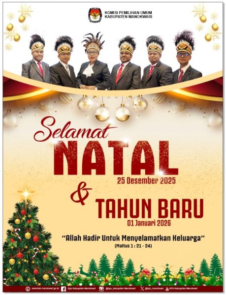Segenap keluarga Besar Komisi Pemilihan Umum Kabupaten Manokwari Mengucapkan Selamat Merayakan Natal 25 Desember 2025 dan Selamat Memasuki Tahun baru 1 Januari 2026 Semoga Natal membawa kedamaian, kasih, dan sukacita, serta Tahun Baru menjadi awal yang penuh harapan, keberkahan, dan kesuksesan bagi kita semua. ....