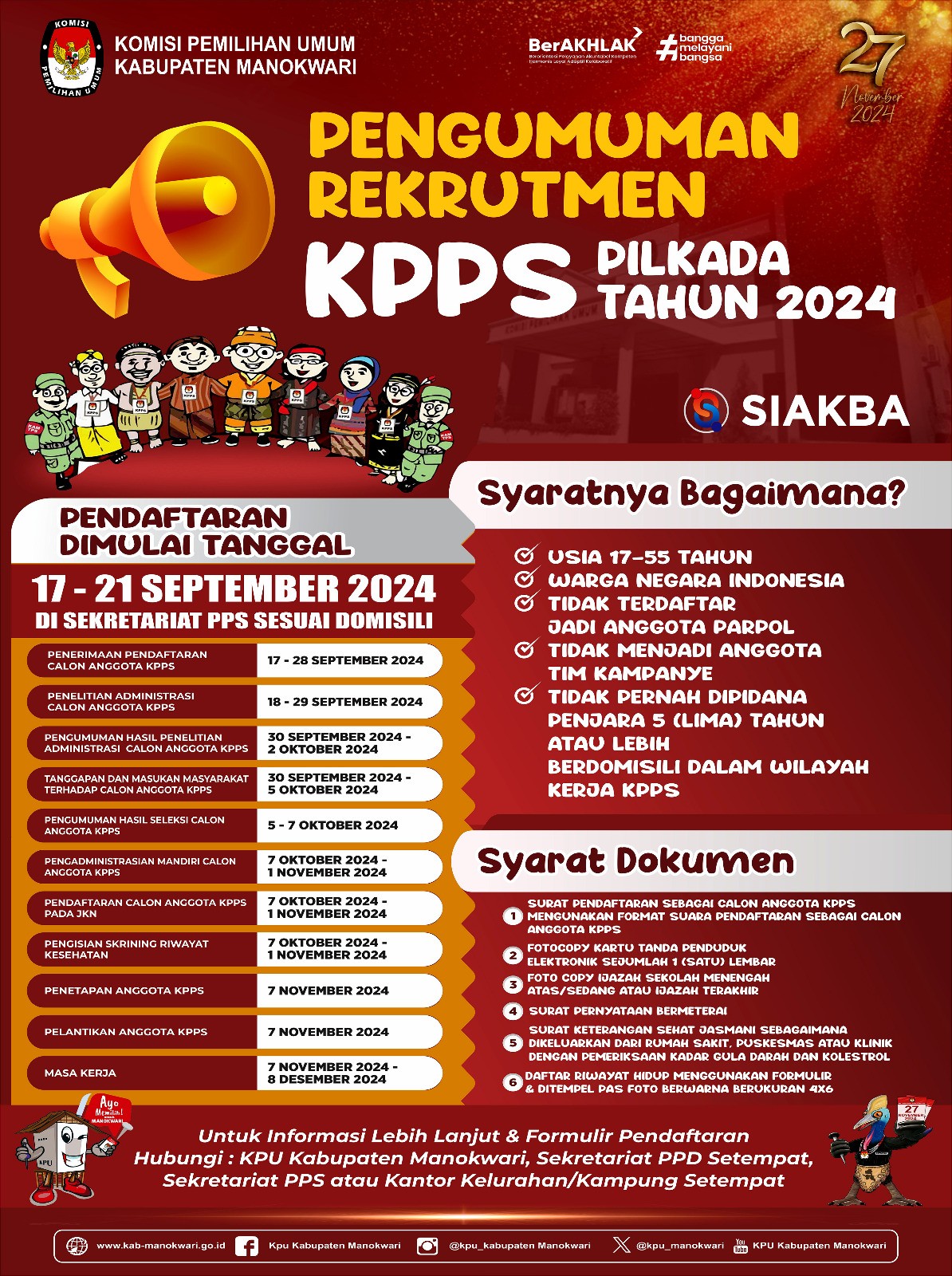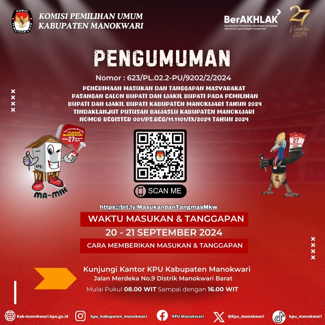 KPU Kab. Manokwari pada Jumat, 6 Desember 2024 bertempat di Aula Kantor KPU Kabupaten Manokwari telah melaksanakan Rapat Pleno Rekapitulasi Hasil Penghitungan Perolehan Suara dan Penetapan Hasil Pemilihan Bupati dan Wakil Bupati Manokwari Tahun 2024.