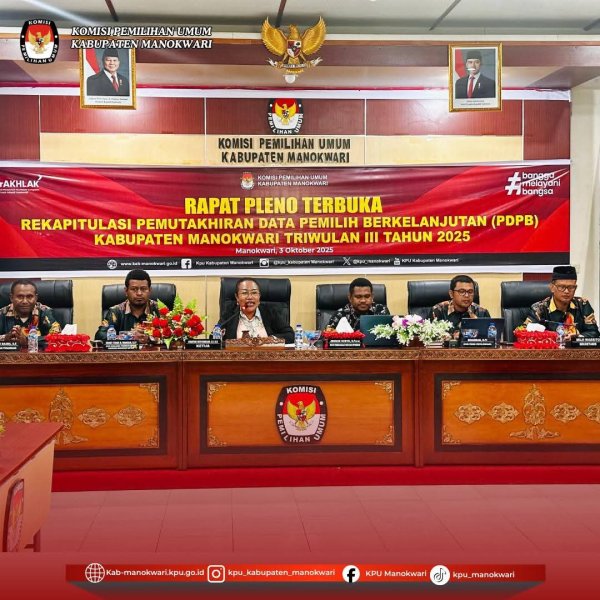 Komisi Pemilihan Umum (KPU) Kabupaten Manokwari melaksanakan Rapat Pleno Rekapitulasi Pemutakhiran Data Pemilih Berkelanjutan (PDPB) Triwulan III Tahun 2025. Berlansung di Aula KPU Kabupaten Manokwari, yang dihadiri oleh Ketua dan Anggota Bawaslu Kabupaten Manokwari, Forkopimda Kabupaten Manokwari, dan juga Anggota Komisioner KPU Provinsi Papua Barat Divisi Hukum dan Pengawasan, Bapak Adi Murat Selaku Tim Pemantau Jumat, (03/10/2025). Kegiatan ini bertujuan untuk memastikan data Pemilih tetap terjaga muktahir,akurat dan komprehensif sebagai bagian dari upaya penyelenggaraan Pemilu yang transparan dan akuntabel. Ketua KPU Kabupaten Manokwari, Christine R.Rumkabu dalam sambutannya menyampaikan bahwa pelaksanaan rapat pleno rekapitulasi pemuktahiran data pemilih berkelanjutan (PDPB) kabupaten manokwari triwulan III tahun 2025, sesuai dengan pasal 19 ayat 2 peraturan KPU nomor 1 tahun 2025 tentang pemuktahiran data pemilih berkelanjutan. Tujuan PDPB adalah untuk memutakhirkan data pemilih dengan akurat dan muktahir, memadukan data pemilihan terakhir dengan data yang diturunkan dari Kemendagri yang dilakukan setiap tiga bulan untuk memastikan adanya pengalihan status pemilih. sementara itu Anggota KPU Kabupaten Manokwari Divisi Perencanaan, Data dan Informasi, Bapak Jekson Hosyo membacakan rekapitulasi data pemilih dari masing-masing distrik. KPU Kabupaten Manokwari menetapkan jumlah data pemilih berkelanjutan Triwulan III Tahun 2025 sebanyak 134.087 pemilih, terdiri dari 67.104 laki-laki dan 66.983 perempuan. Sebagai penutup rangkaian kegiatan, dilakukan penyerahan Berita Acara Hasil Rapat Pleno Terbuka Rekapitulasi Daftar Pemilih Berkelanjutan Triwulan III Tahun 2025 kepada para pihak terkait. melalui kegiatan ini KPU kabupaten manokwari berharap sinergi dengan seluruh pihak terus terjalin, sehingga daftar pemilih yang dihasilkan benar-benar mencerminkan kondisi rill masyarakat, dan dapat menjadi landasan penting dalam penyelenggaraan Pemilu yang jujur, adil dan demokratis. Berdasarkan berita acara dan Surat Keputusan rekapitulasi pemuktahiran data pemilih berkelanjutan (PDPB) kabupaten manokwari triwulan III tahun 2025,  sebagai berikut:Klik Disini