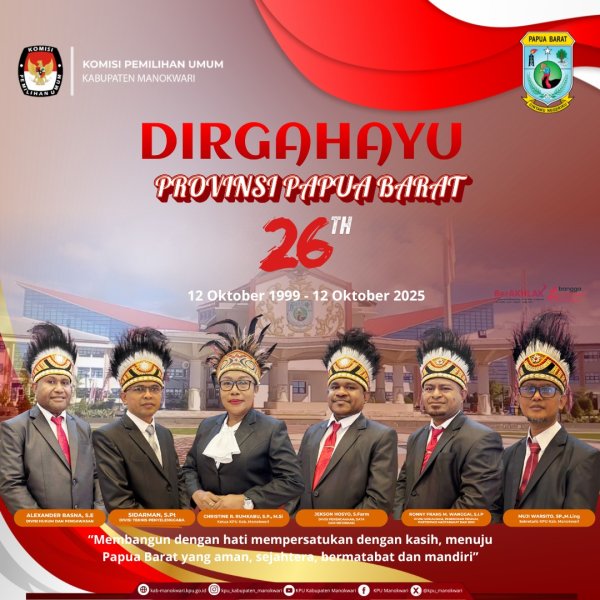 #PaceMace #TemanPemilih, seluruh jajaran KPU Kabupaten Manokwari mengucapkan Dirgahayu Provinsi Papua Barat, 26 Oktober 2025.