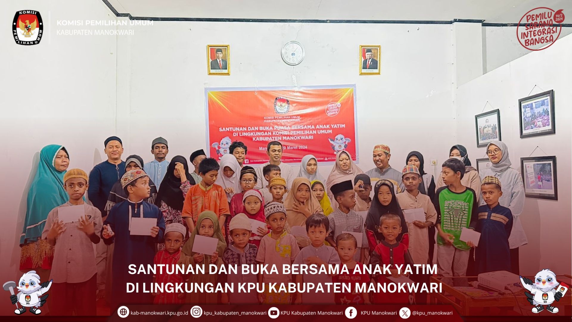 #PaceMace #TemanPemilih, KPU Kab. Manokwari pada Jumat (29/3) mengadakan Santunan dan Buka Puasa Bersama Anak Yatim di Lingkungan KPU Kab. Manokwari bertempat di Yayasan Kesejahteraan Madani, Manokwari. Kegiatan ini dihadiri oleh Anggota KPU Kab. Manokwari, Staf Sekretariat KPU Kab. Manokwari serta Pengurus Yayasan. Kegiatan ini dilaksanakan secara serentak di seluruh satuan kerja KPU se-Indonesia guna mempererat tali silaturahmi.