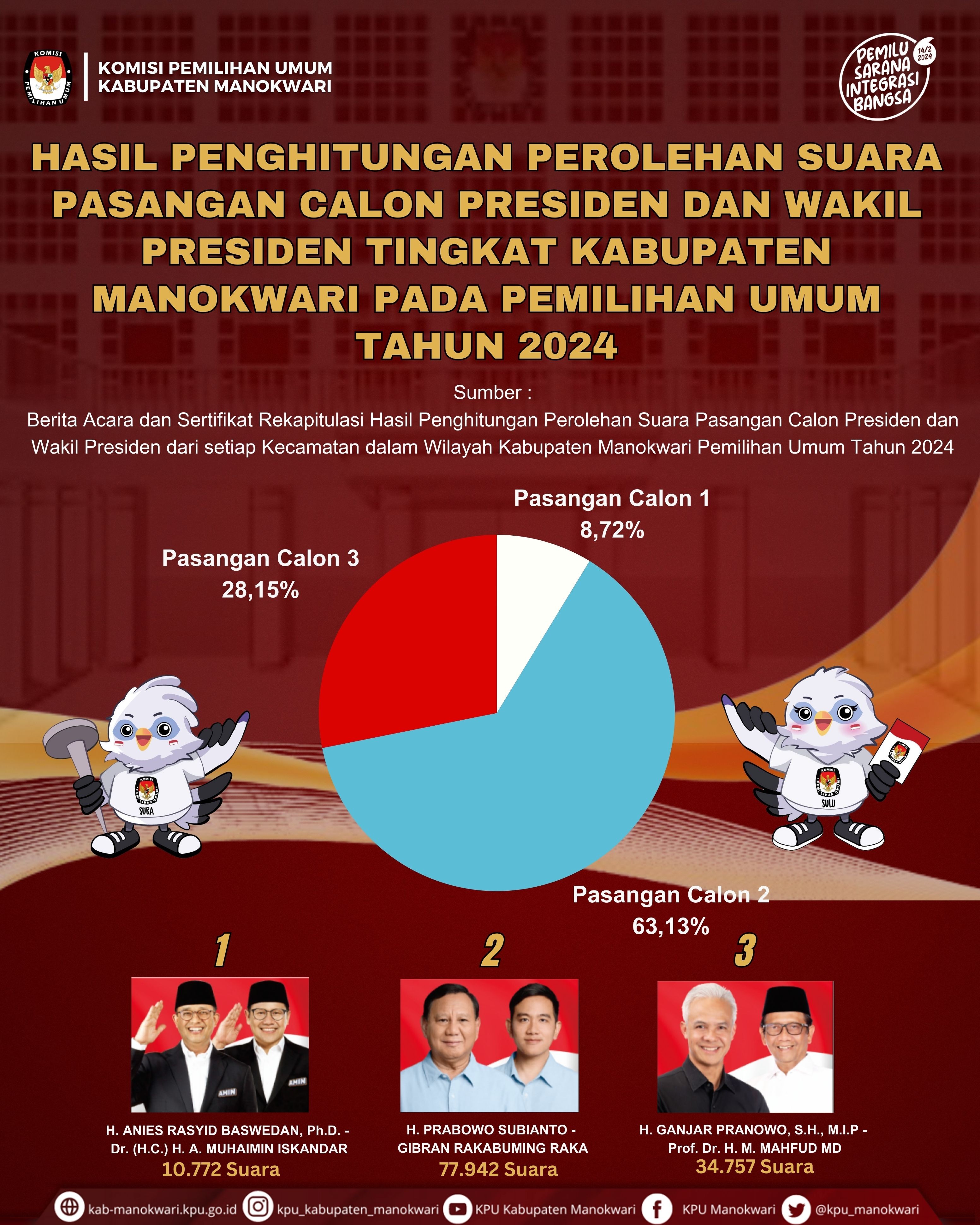 #PaceMace #TemanPemilih Berikut infografis Rekapitulasi Hasil Penghitungan Perolehan Suara Pasangan Calon Presiden dan Wakil Presiden tingkat Kabupaten Manokwari pada Pemilu Tahun 2024.
