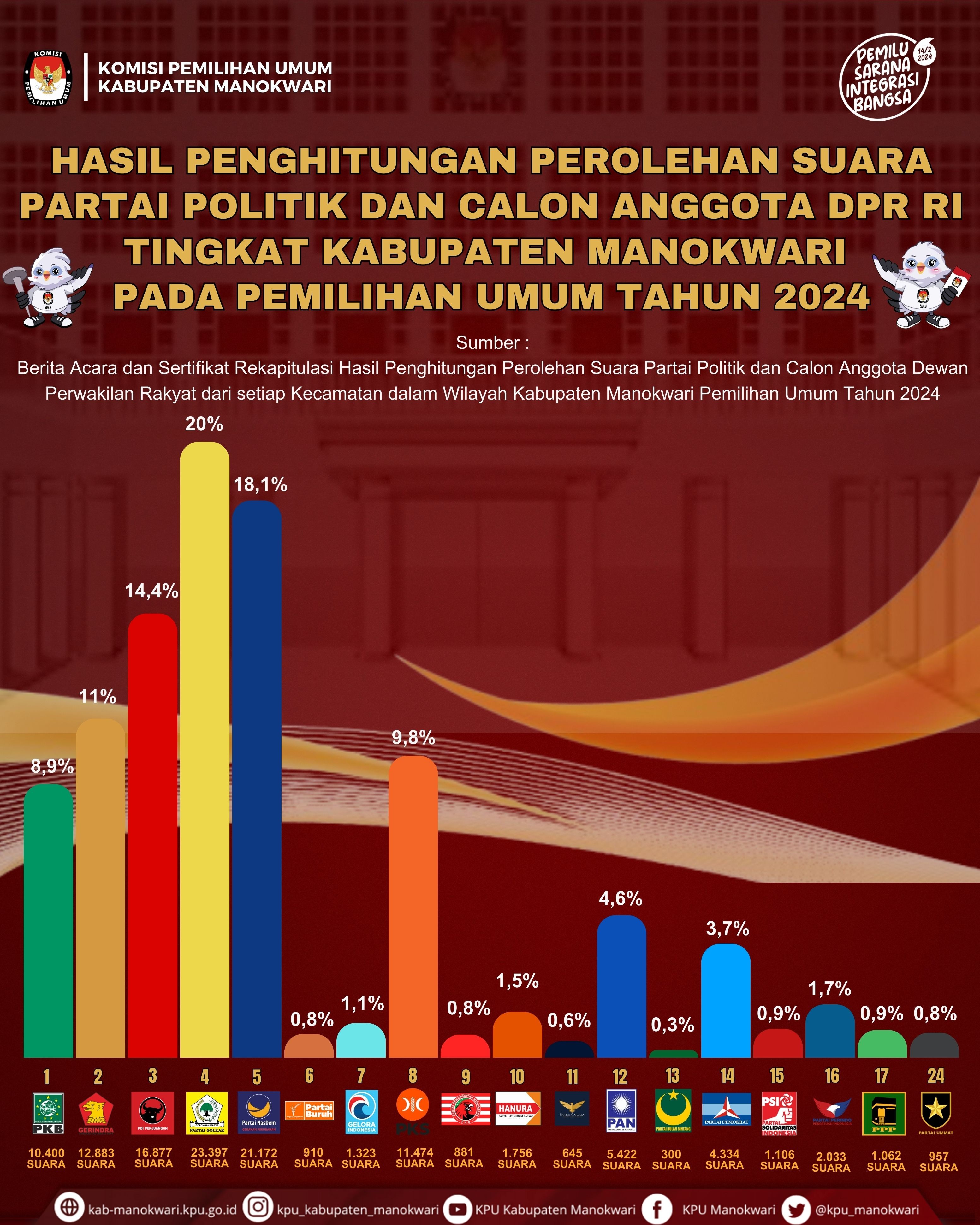 #PaceMace #TemanPemilih Berikut infografis Rekapitulasi Hasil Penghitungan Perolehan Suara Partai Politik dan Calon Anggota DPR RI tingkat Kabupaten Manokwari pada Pemilu Tahun 2024.