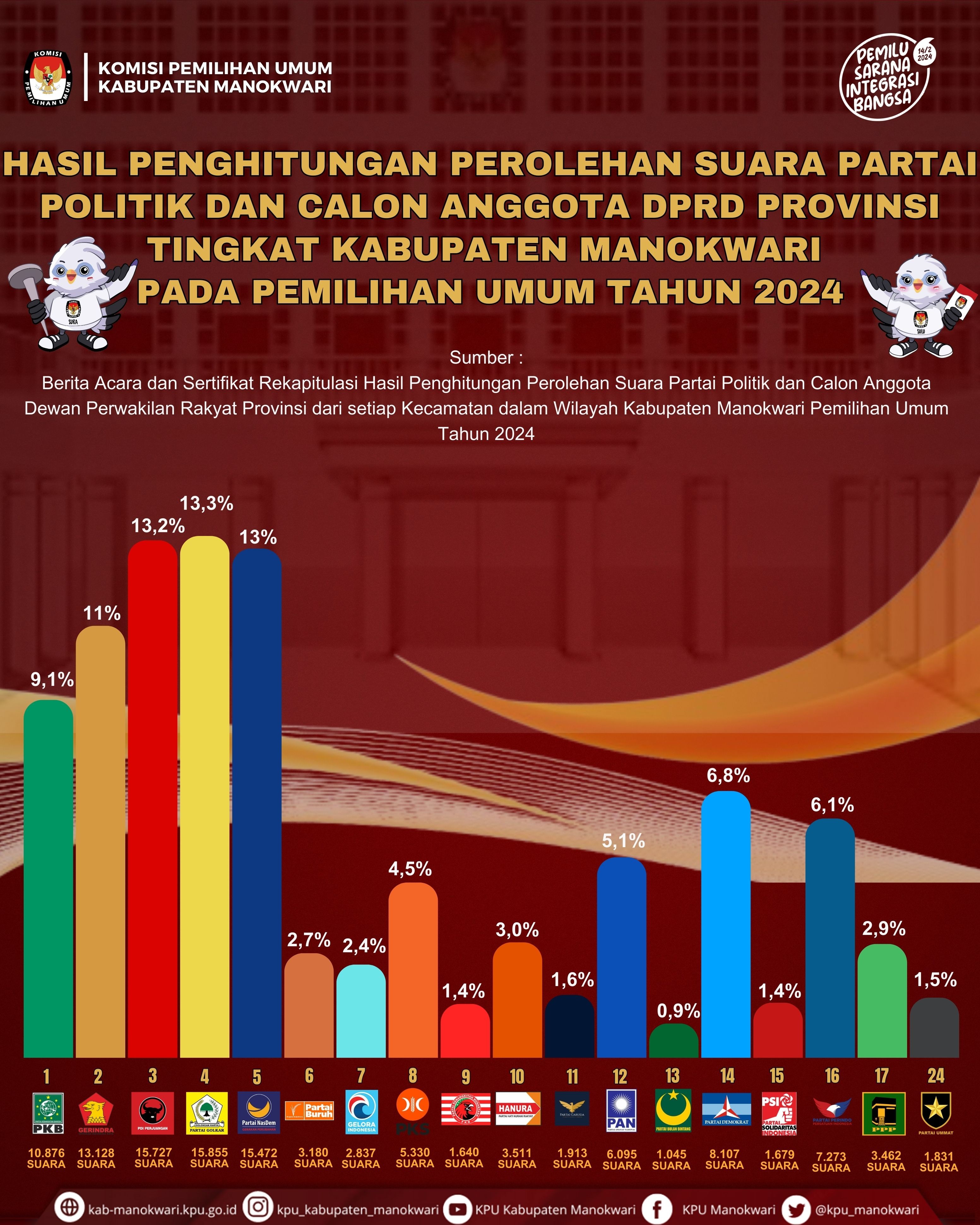 #PaceMace #TemanPemilih Berikut infografis Rekapitulasi Hasil Penghitungan Perolehan Suara Partai Politik dan Calon Anggota DPRD Provinsi tingkat Kabupaten Manokwari pada Pemilu Tahun 2024.