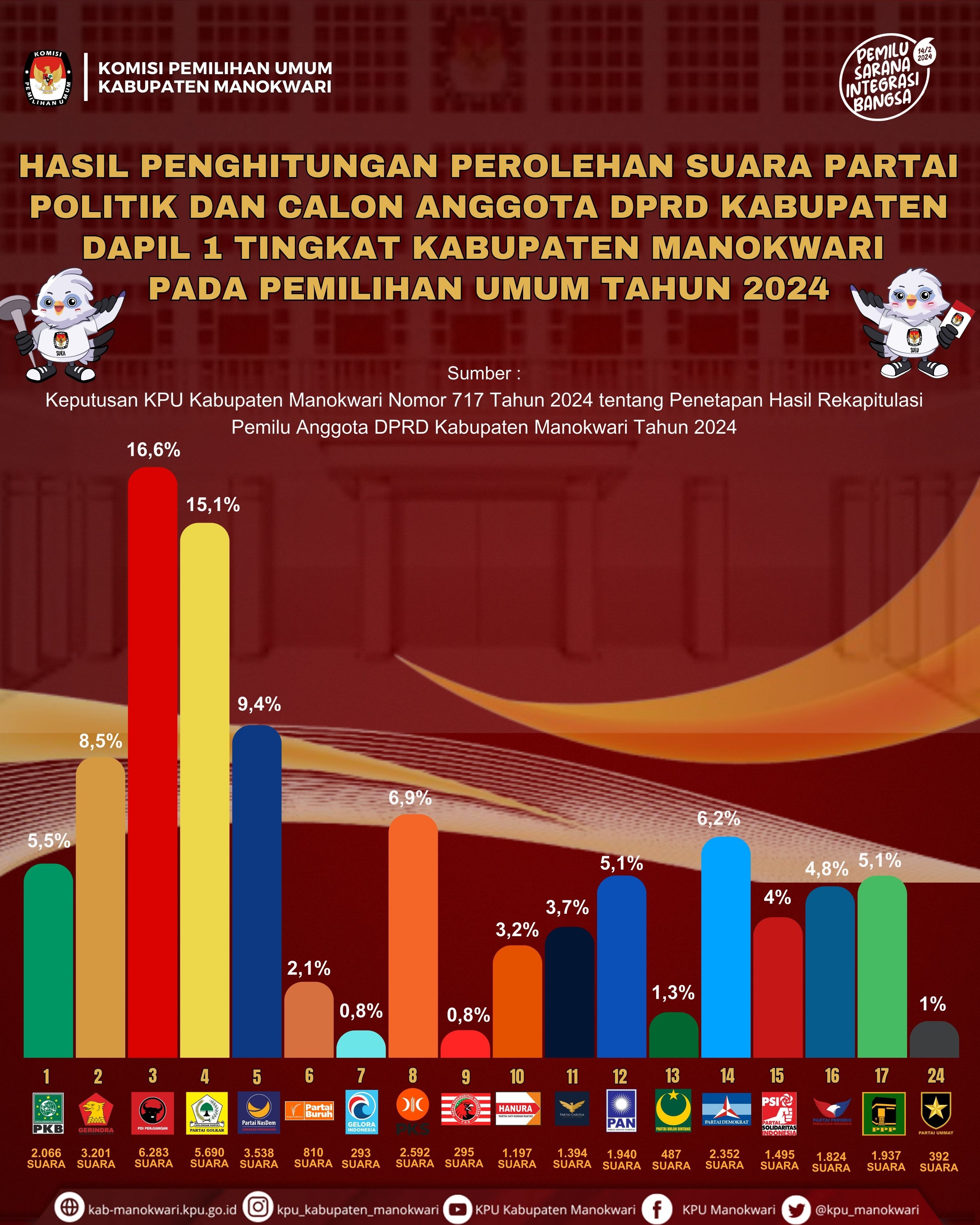 #PaceMace #TemanPemilih Berikut infografis Rekapitulasi Hasil Penghitungan Perolehan Suara Partai Politik dan Calon Anggota DPRD Kabupaten tingkat Kabupaten Manokwari pada Pemilu Tahun 2024.