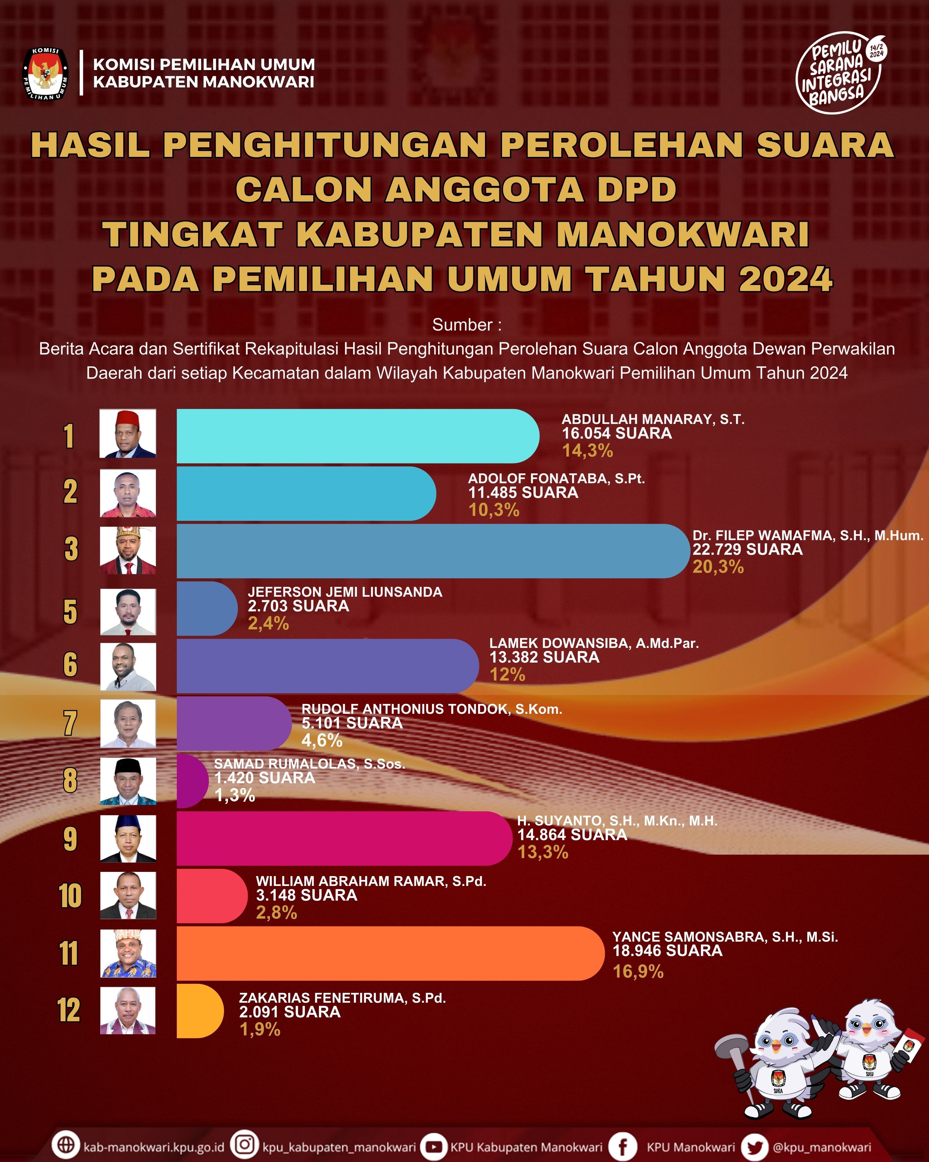 #PaceMace #TemanPemilih Berikut infografis Rekapitulasi Hasil Penghitungan Perolehan Suara Calon Anggota DPD tingkat Kabupaten Manokwari pada Pemilu Tahun 2024.