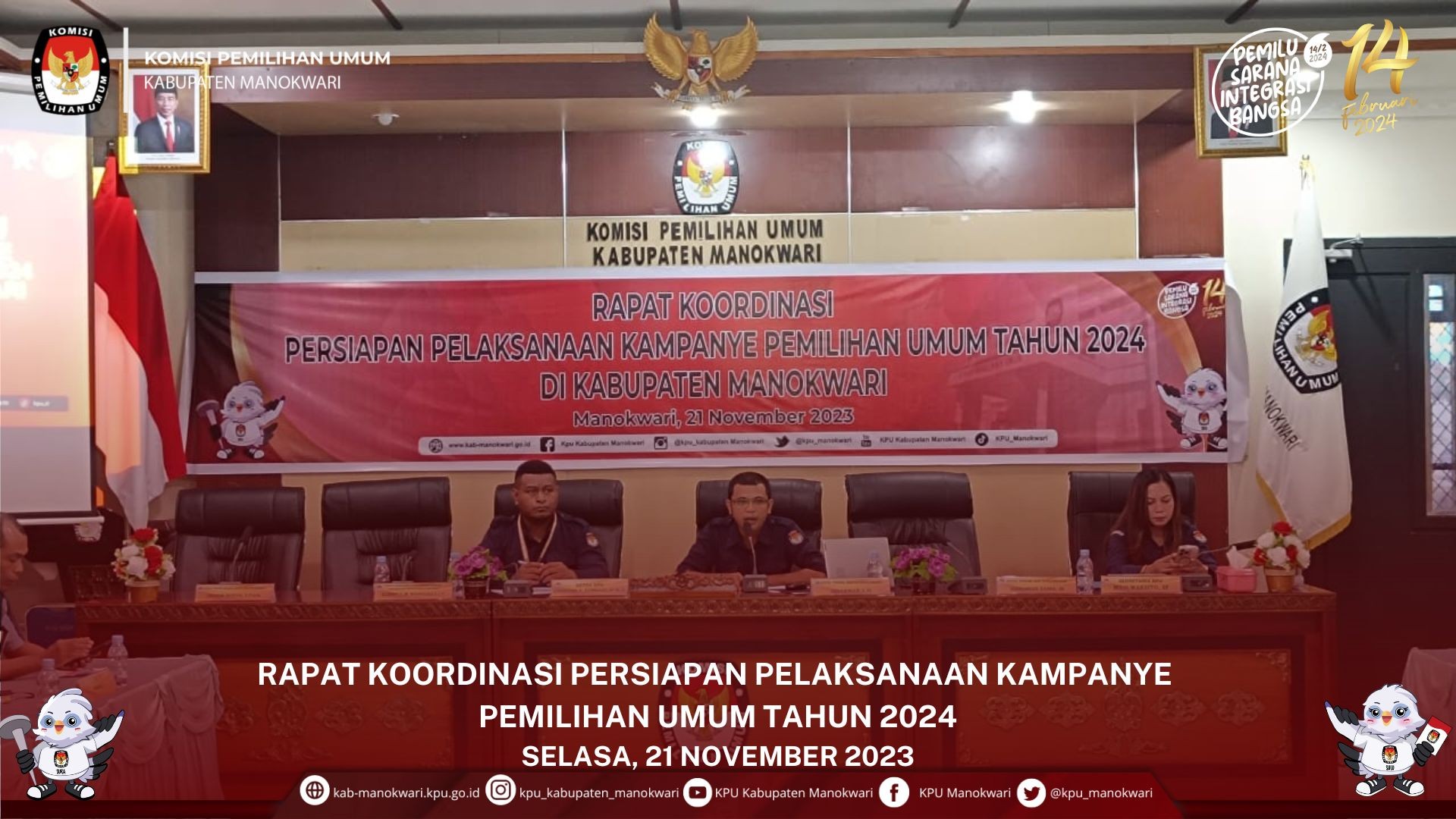 #PaceMace #TemanPemilih, KPU Kab. Manokwari melaksanakan kegiatan Rapat Koordinasi Persiapan Pelaksanaan Kampanye Pemilihan Umum Tahun 2024 bertempat di Aula Kantor KPU Kab. Manokwari, Selasa (21/11/23).