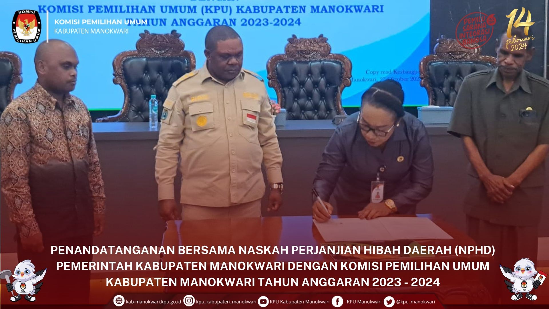 Pemerintah Kabupaten Manokwari bersama Komisi Pemilihan Umum (KPU) Kabupaten Manokwari, Papua Barat, menandatangani naskah perjanjian hibah daerah (NPHD) sebagai dukungan pelaksanaan Pemilihan Kepala Daerah (Pilkada) 2024. Bupati Manokwari Hermus Indou bersama Ketua KPU Kabupaten Manokwari Christine R. Rumkabu menandatangani NPHD senilai Rp50 miliar. Dalam penandatanganan ini disaksikan Ketua Bawaslu Kabupaten Manokwari Yustinus Yosep Maturan dan Wakil Ketua II DPRD Kabupaten Manokwari Bonz Rumbruren di Manokwari, Jumat (27/10). "Penyelenggaraan pemilu dan pilkada adalah amanat dan kewajiban konstitusi. Pemerintah berkewajiban menyukseskan pilkada dan pemilu," kata Bupati Hermus. Hermus menyebutkan nilai NPHD sebesar Rp50 miliar adalah hasil kesepakatan dari rapat Pemkab Manokwari bersama KPU setempat. Besaran hibah tersebut berdasarkan kemampuan keuangan daerah dan penyalurannya secara bertahap. Setelah penandatanganan NPHD, Pemkab Manokwari segera mentransfer 40 persen dari Rp50 miliar atau Rp20 miliar ke rekening kas KPU. Sisanya akan disalurkan pada tahun depan sesuai dengan aturan yang berlaku. "Kita berharap pemilu dan pilkada bisa berjalan aman, jurdil, lancar, dan efektif sehingga hasilkan pemimpin terbaik," kata Bupati. Hermus berharap KPU dapat mengelola dana hibah dengan baik dan profesional. Alokasi anggaran harus disesuaikan dengan kebutuhan di lapangan. Hal ini menjadi kewajiban Pemkab Manokwari untuk memastikan penyelenggara tidak kekurangan anggaran. Ketua KPU Kabupaten Manokwari Christine R. Rumkabu mengatakan bahwa pihaknya patut berbangga dan mengapresiasi pemerintah daerah karena dari tujuh kabupaten di Provinsi Papua Barat, Pemkab Manokwari jadi yang pertama menyetujui dan mengesahkan NPHD. "Kami memberi apresiasi pada pemerintah daerah, Bupati Manokwari bersama Tim Anggaran Pemerintah Daerah (TAPD) yang telah bekerja dengan cepat untuk sukseskan agenda nasional ini," ujarnya. Dengan penetapan hibah yang cepat, kata Christine, KPU siap melaksanakan pilkada kapan pun. Karena pilkada yang awalnya diagendakan November, ada wacana digeser maju pada bulan September.