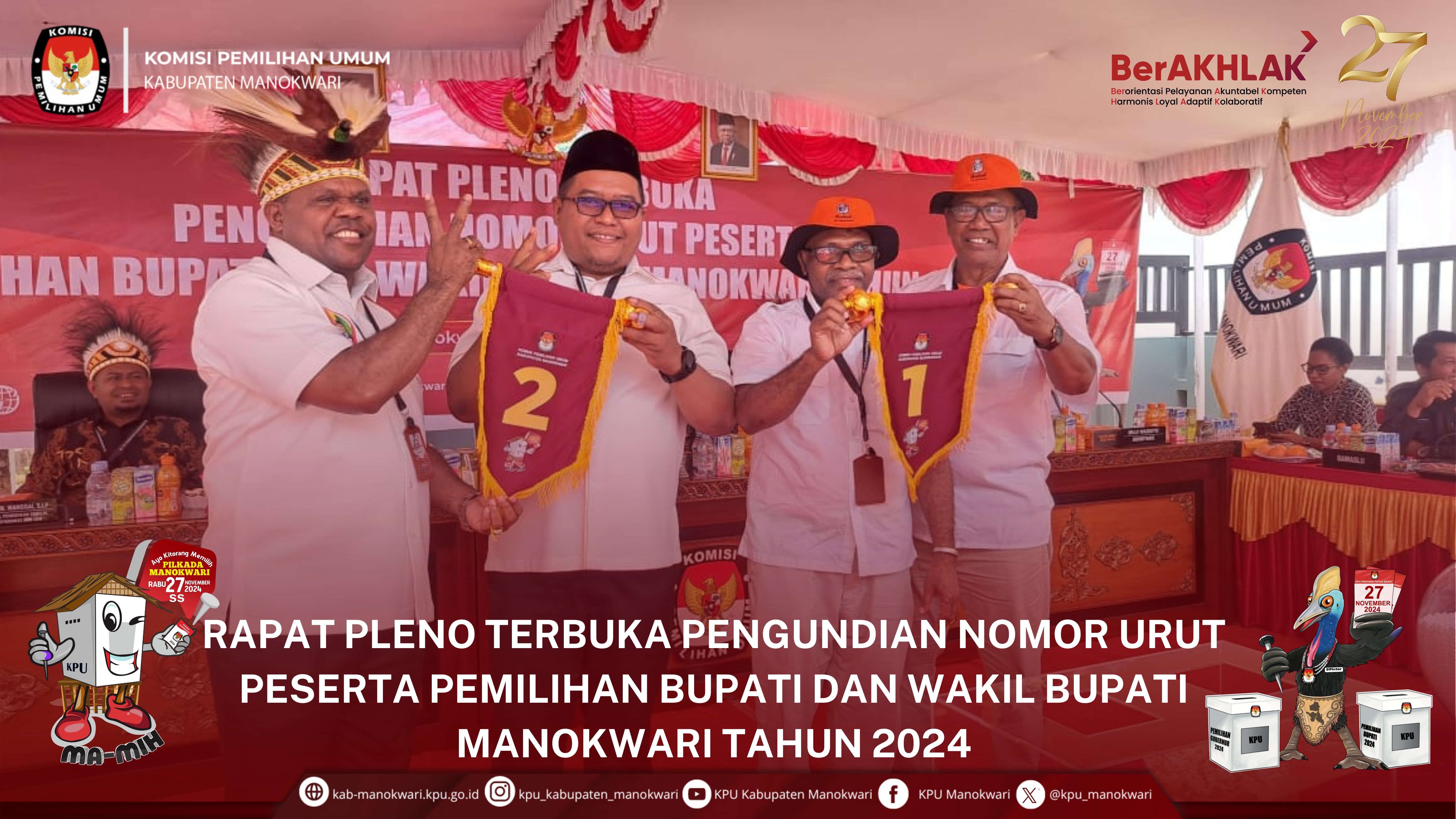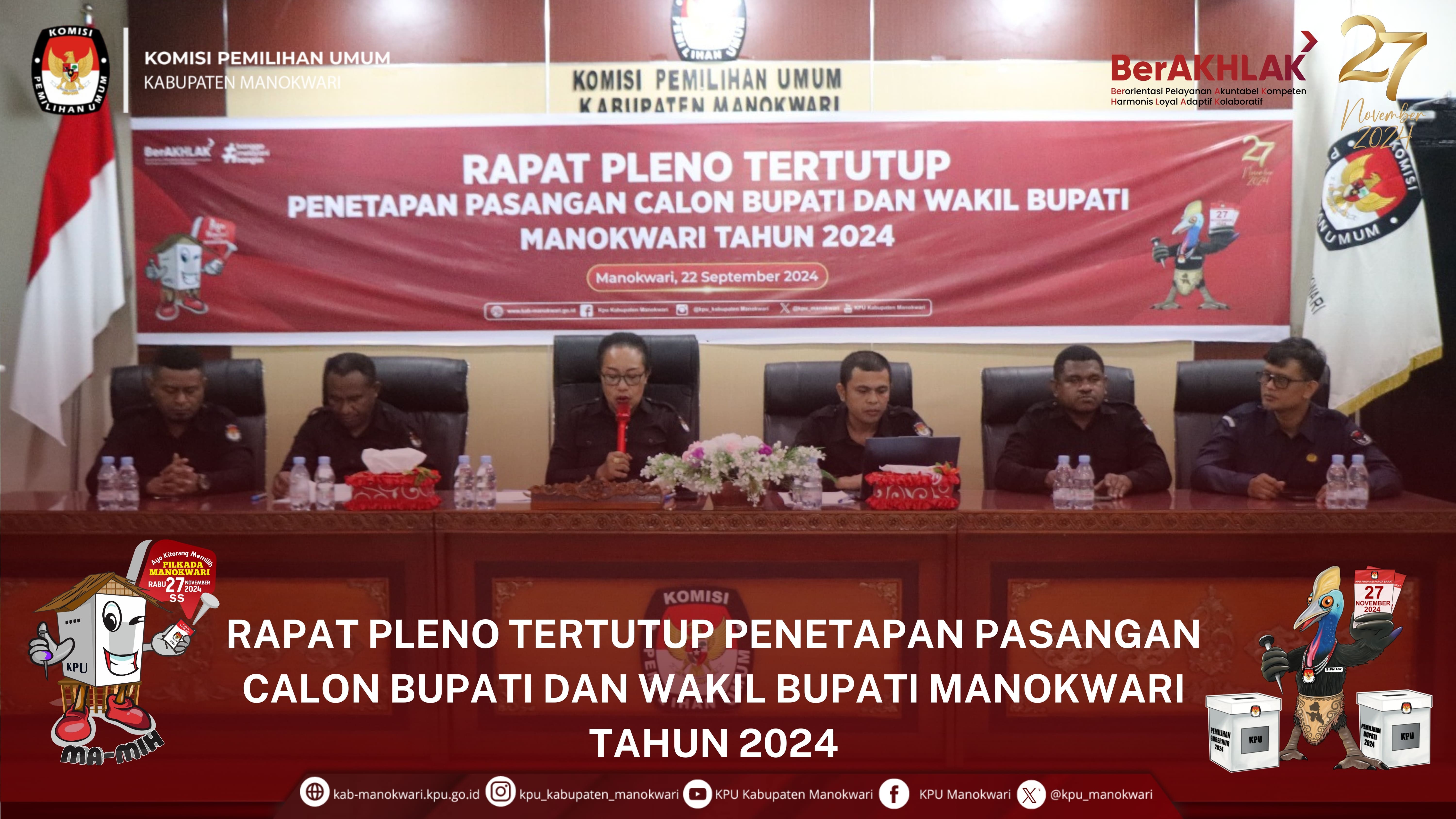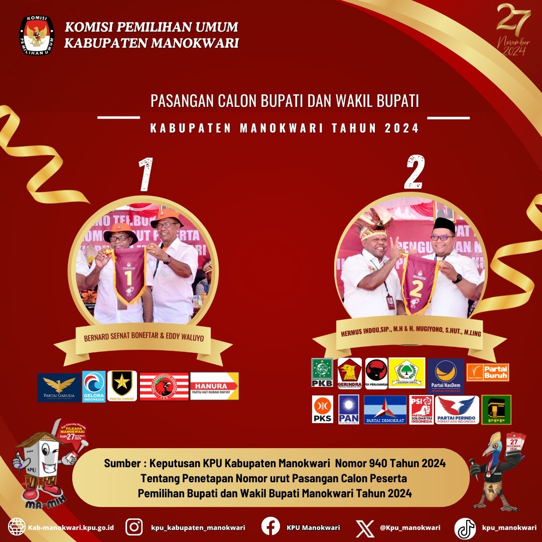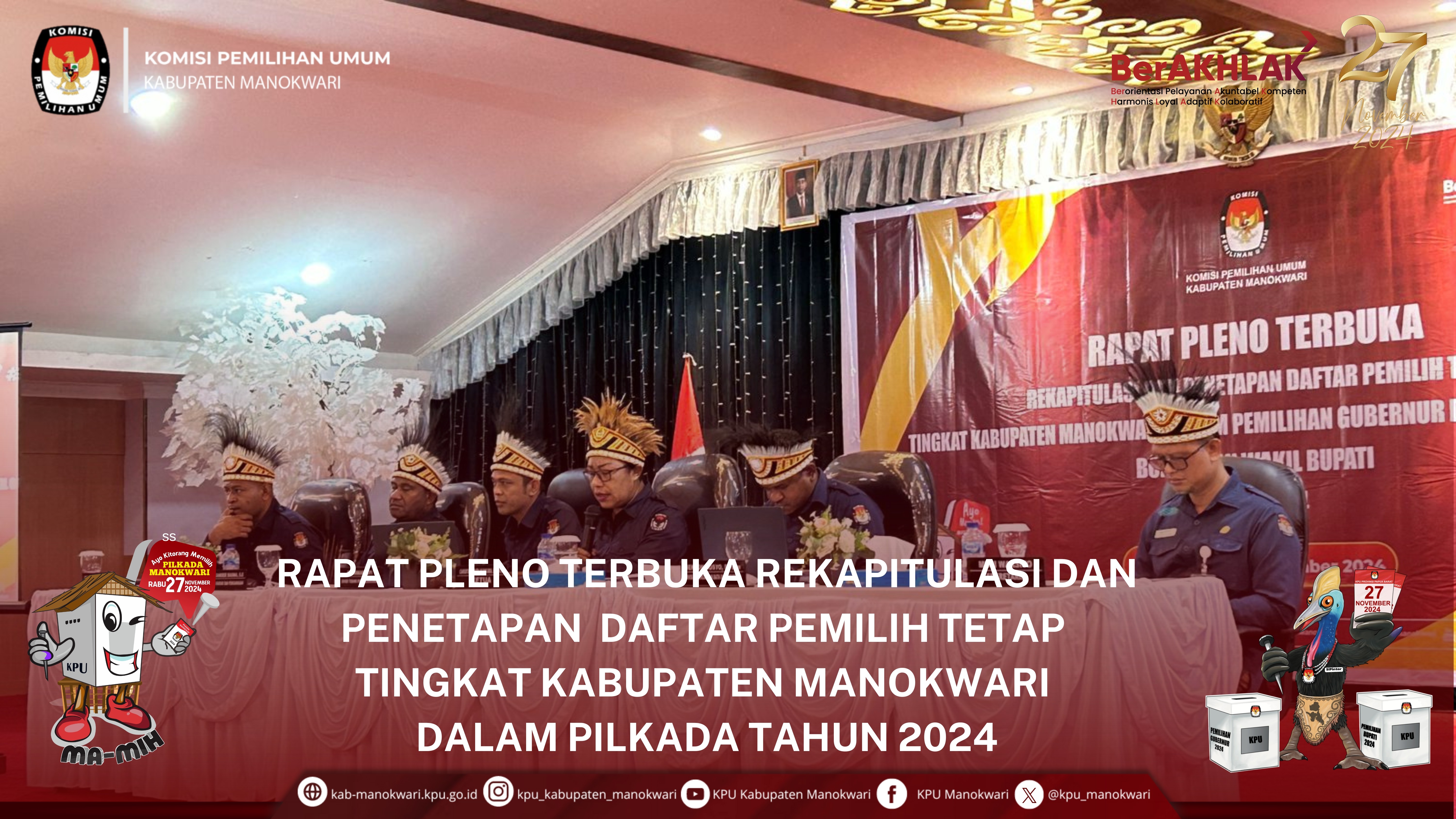 Rapat Pleno Rekapitulasi dan Penetapan Daftar Pemilih Tetap (DPT) Tingkat Kabupaten Manokwari Pilkada Tahun 2024 menetapkan jumlah pemilih di Kabupaten Manokwari sebanyak 133.412 (Laki-laki 66.699 dan Perempuan 66.713).