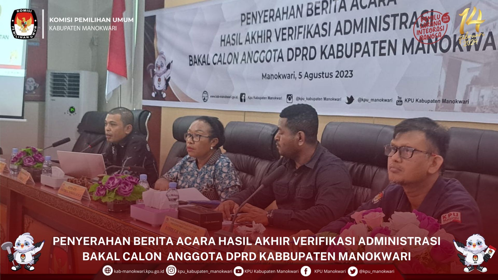 #PaceMace #TemanPemiih KPU Kab. Manokwari pada Sabtu (5/8) melaksanakan Penyerahan Berita Acara Hasil Akhir Verifikasi Administrasi Bakal Calon Anggota DPRD Kabupaten Manokwari bertempat di Aula Kantor KPU Kab. Manokwari dihadiri oleh partai politik peserta pemilu tahun 2024.