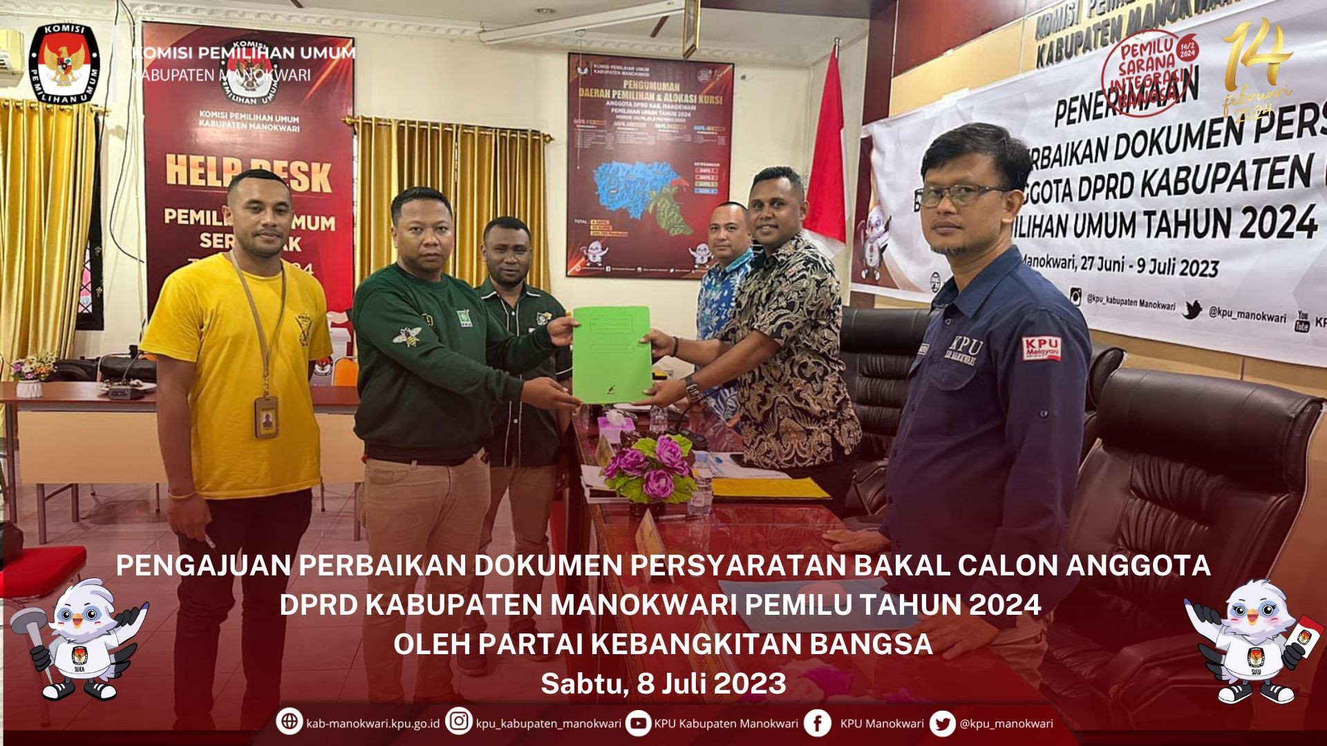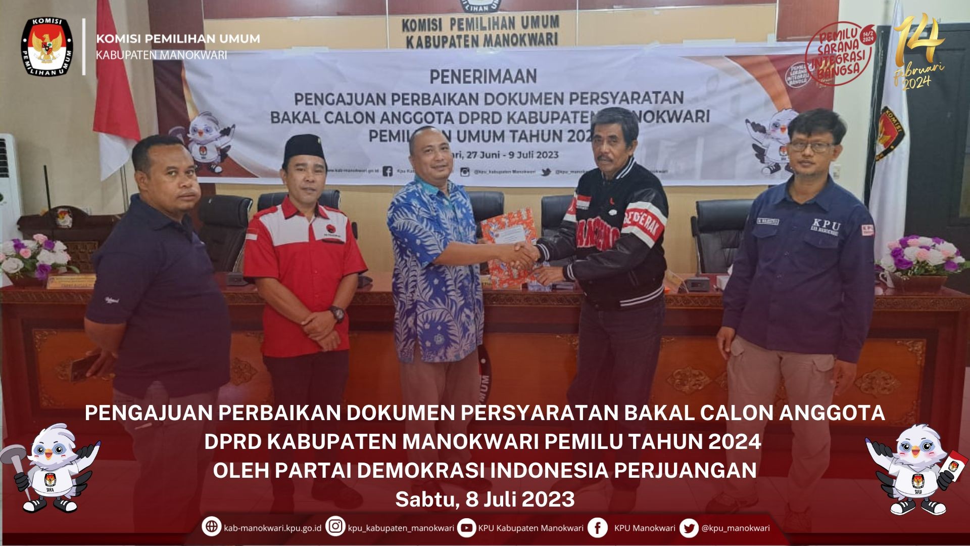 Selanjutnya KPU Kabupaten Manokwari menyerahkan Tanda Terima dan BA Penerimaan pengajuan perbaikan Bakal Calon Kepada Sekretaris PDIP Kabupaten Manokwari dan dokumen BA Penerimaan pengajuan perbaikan Bakal Calon diserahkan ke Bawaslu Kabupaten Manokwari sebagai dokumen pengawasan, dan dilanjutkan dengan Foto Bersama.