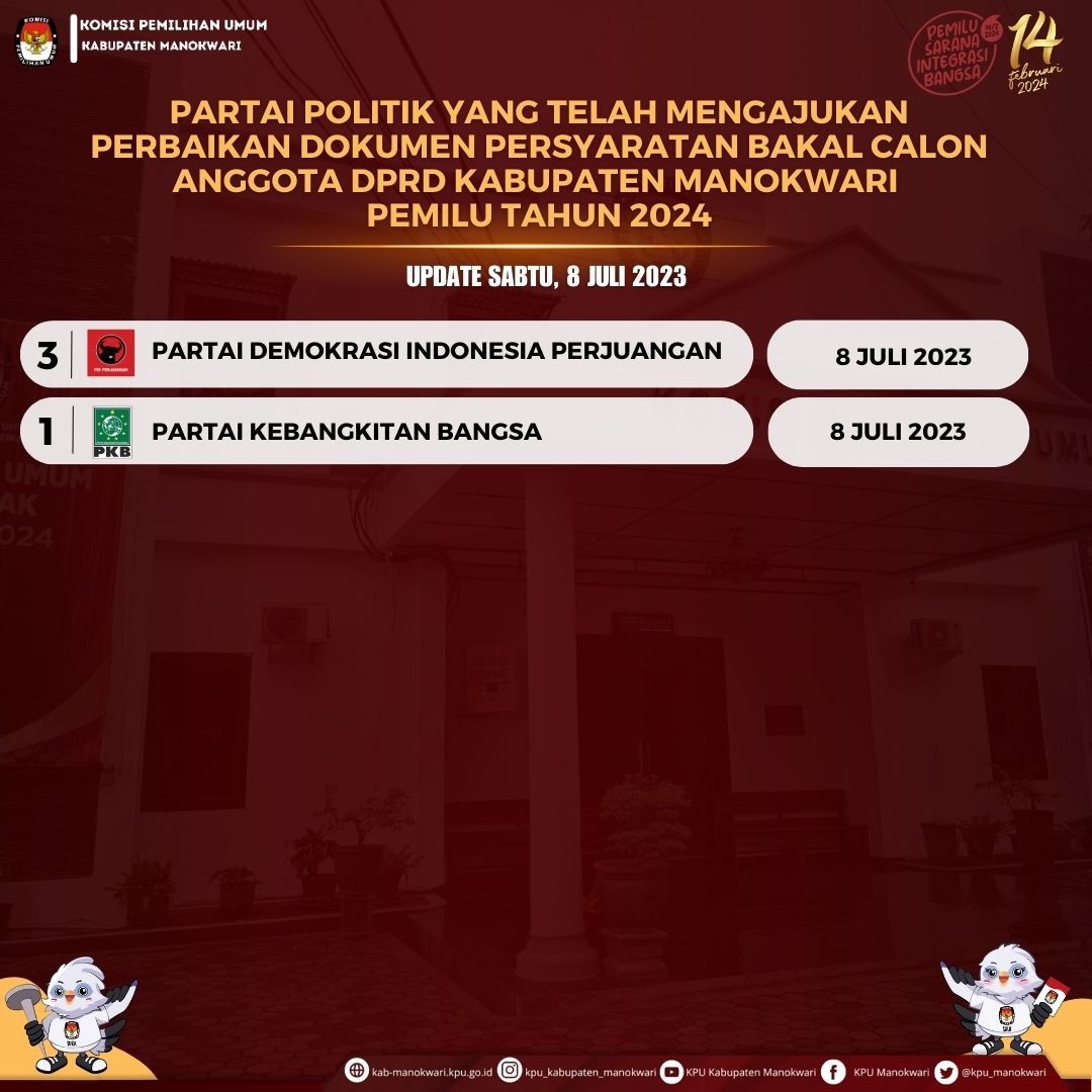 #PaceMace #TemanPemilih KPU Kab. Manokwari pada (8/7) Pukul 10.04 WIT menerima pengajuan perbaikan dokumen persyaratan Bakal Calon Anggota DPRD Kab. Manokwari dari Partai Demokrasi Indonesia Perjuangan. Pengajuan diserahkan oleh Sekretaris PDIP Kab. Manokwari dan diterima oleh Anggota KPU Kab. Manokwari Divisi Sosdiklih Parmas dan SDM.