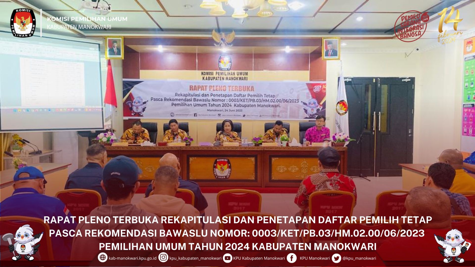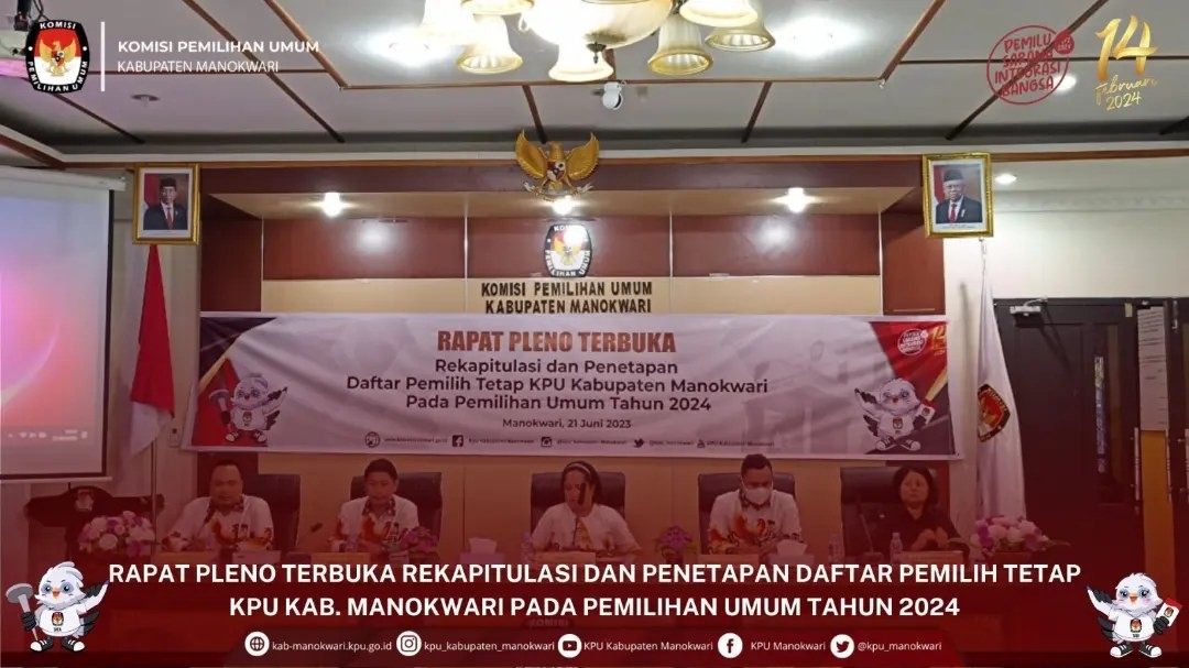 #PaceMace #TemanPemiih KPU Kab. Manokwari pada (21/6) melaksanakan Rapat Pleno Terbuka Rekapitulasi dan Penetapan Daftar Pemilih Tetap KPU Kab. Manokwari pada Pemilihan Umum Tahun 2024 bertempat di Aula Kantor KPU Kab. Manokwari.