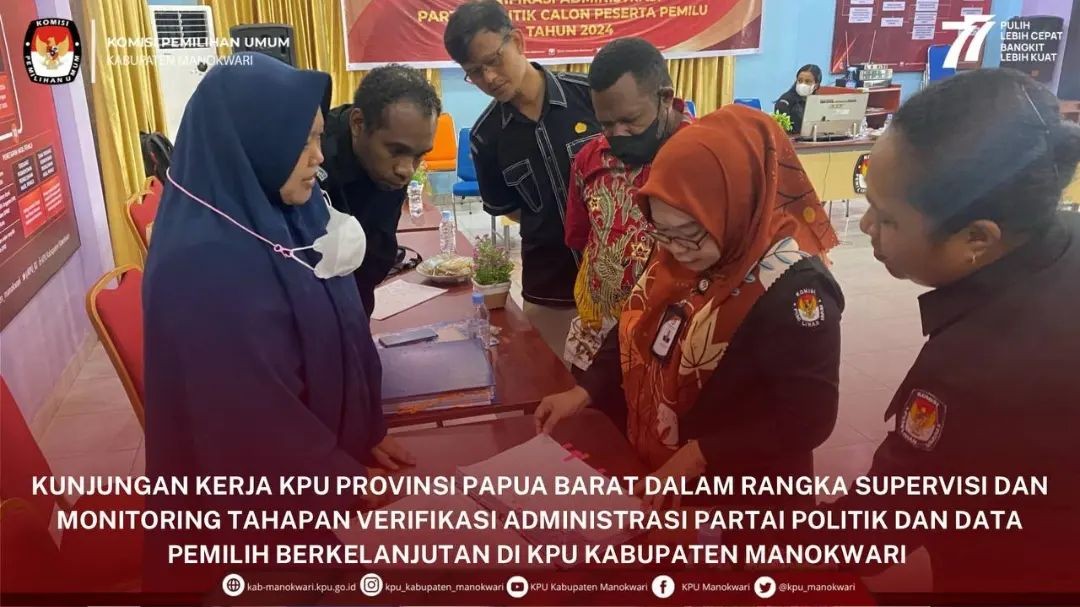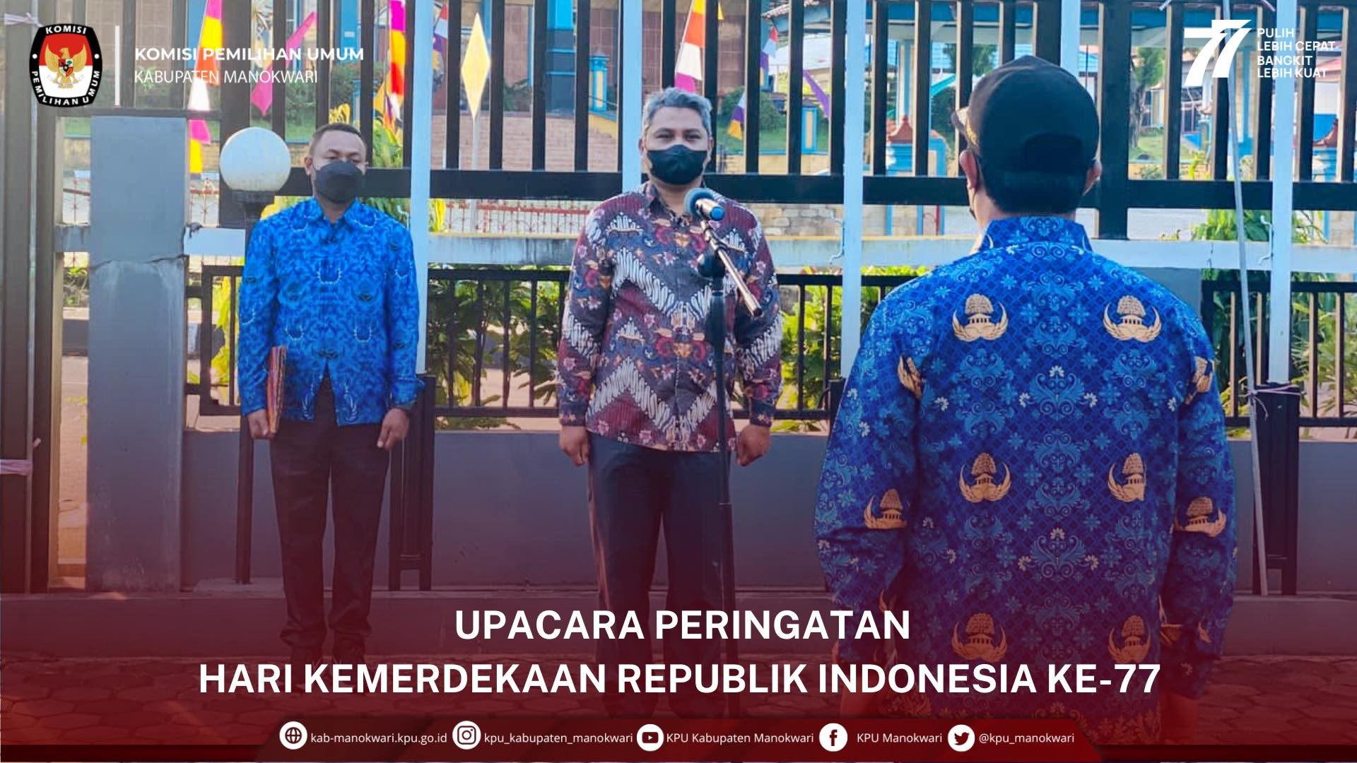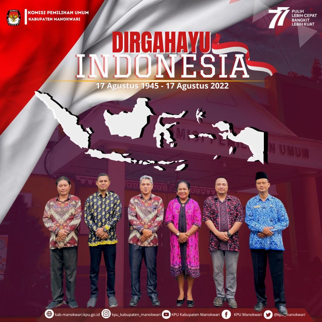 #PaceMace #TemanPemilih , Memperingati Hari Kemerdekaan Republik Indonesia Ke -77, ketua KPU Kabupaten Manokwari Abdul Muin Salewe, Anggota KPU Aplena A.L Rumaikeuw, Fratiano Rahawarin, Fahry Rafli, Hery Lolo bersama Sekretaris KPU Muji Warsito, jajaran Kasubag dan seluruh staf sekretariat KPU melaksanakan Upacara Peringatan Hari Kemerdekaan Republik Indonesia Ke-77 di Halaman Kantor KPU Kabupaten Manokwari.