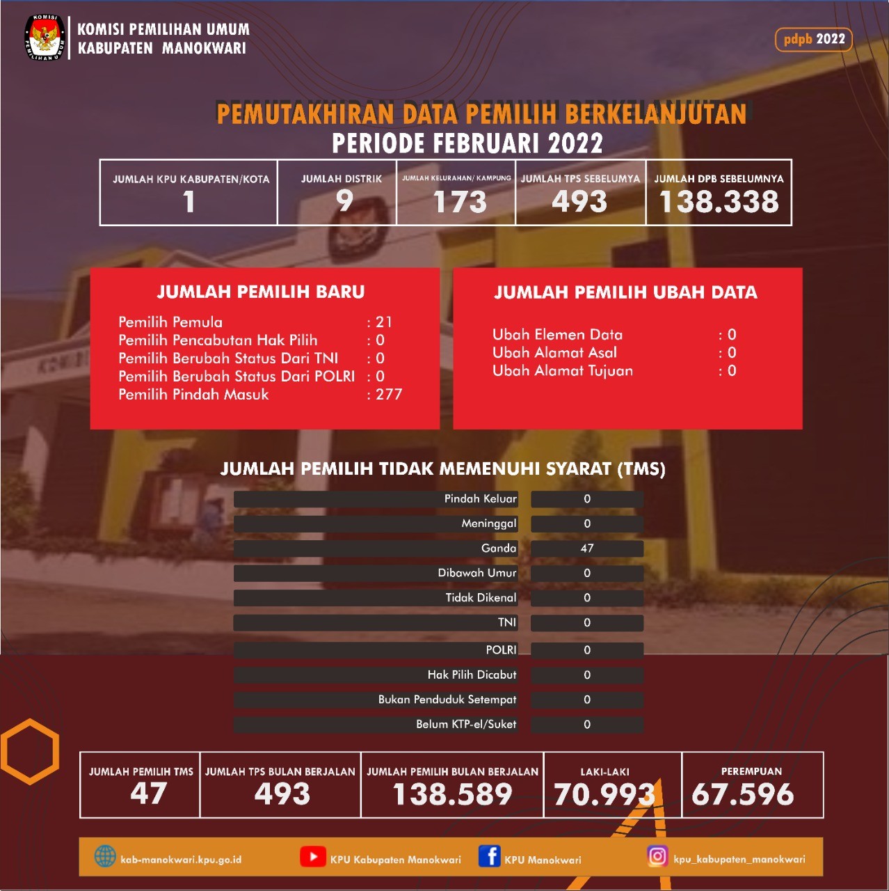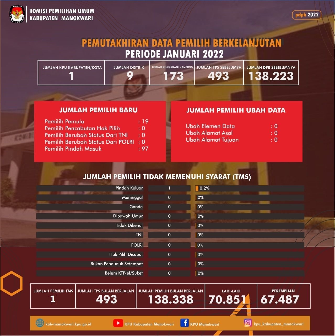 KPU Kabupaten Manokwari telah menetapkan Rekapitulasi Daftar Pemilih Berkelanjutan yang tertuang dalam Berita Acara Nomor : 01/PR.04.1-BA/9202/KPU-Kab/I/2022 Tanggal 5 Januari 2022. ,yang disahkan dalam rapat pleno KPU Kabupaten Manokwari dengan hasil sebagai berikut: