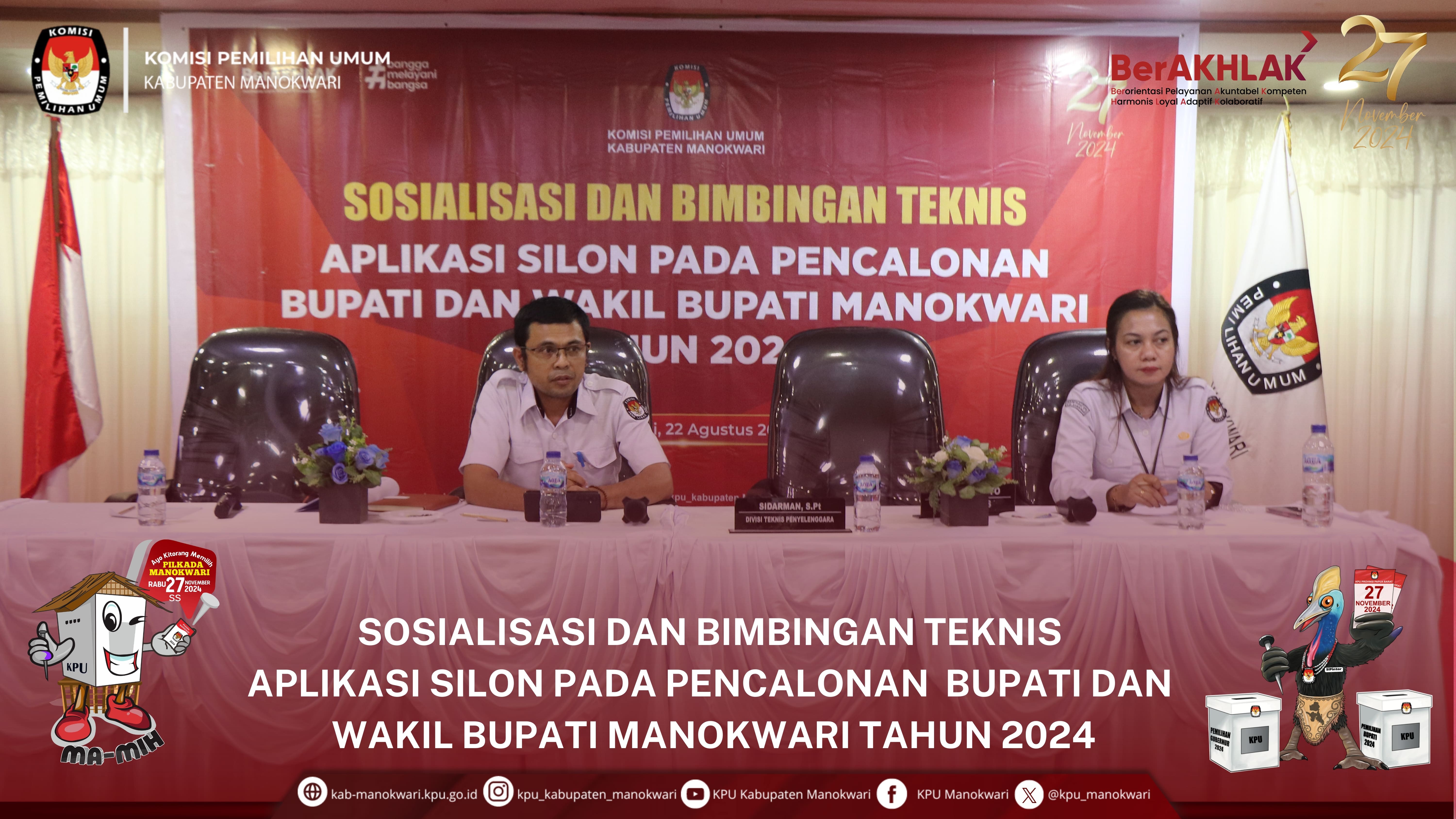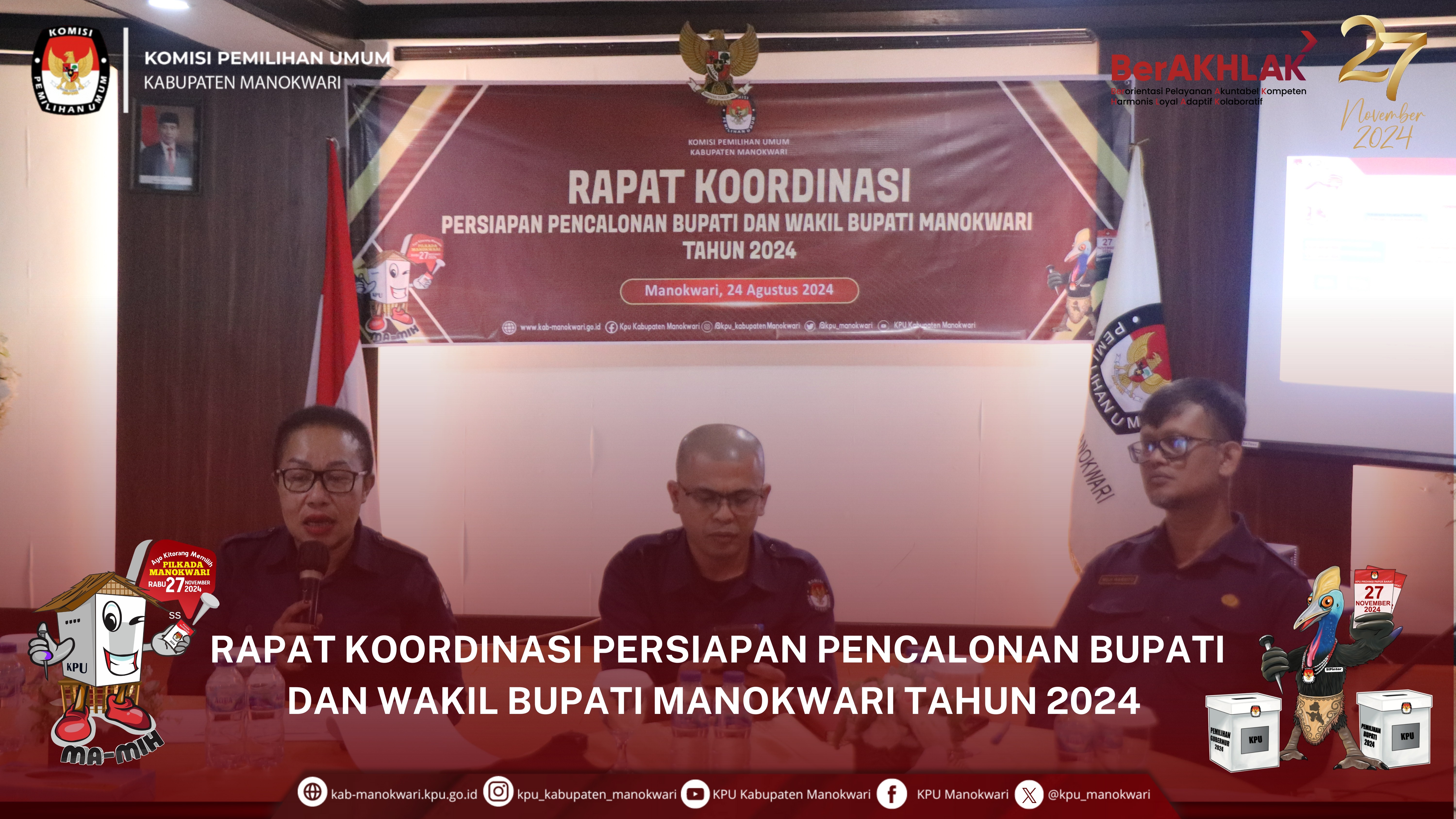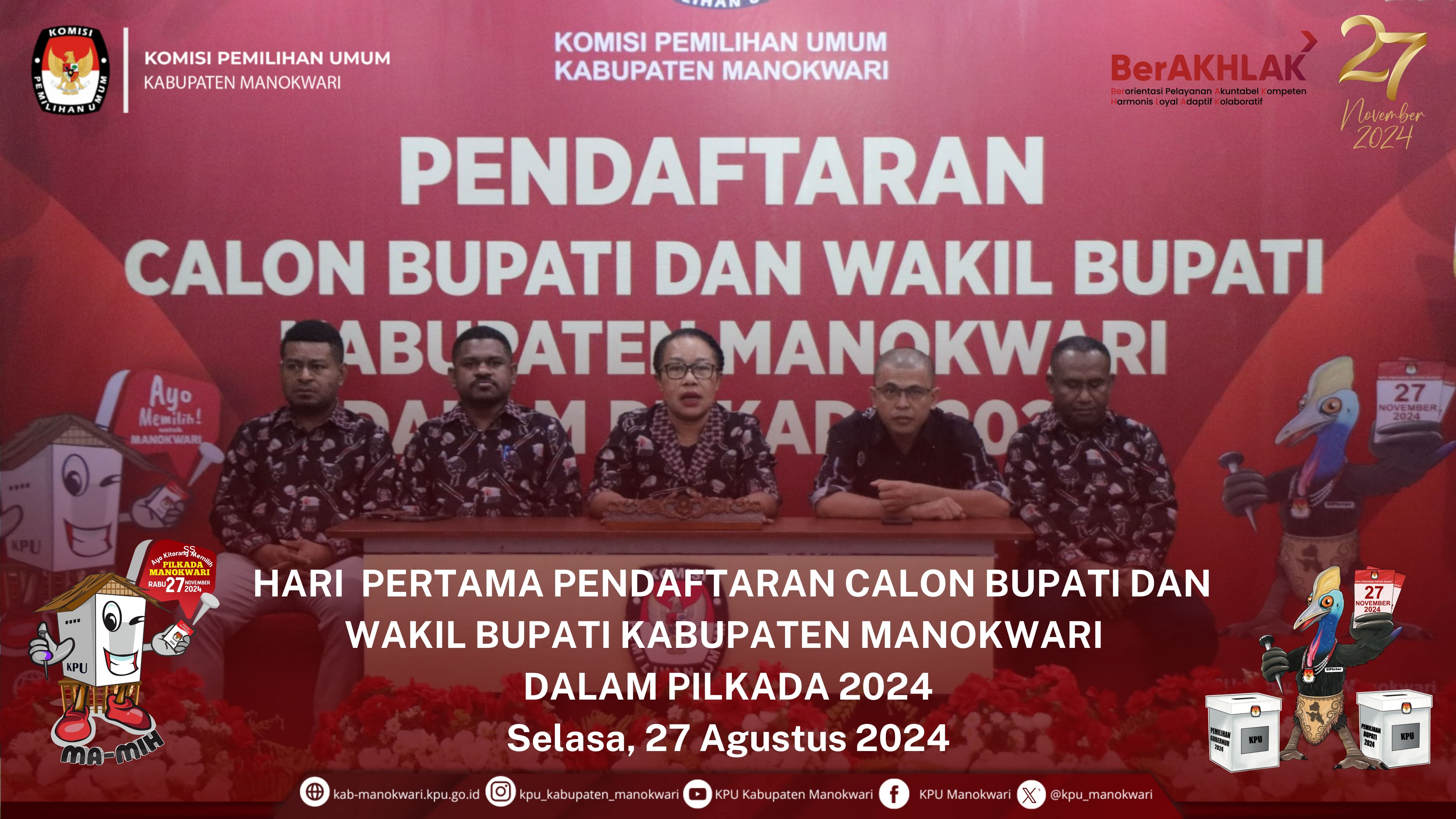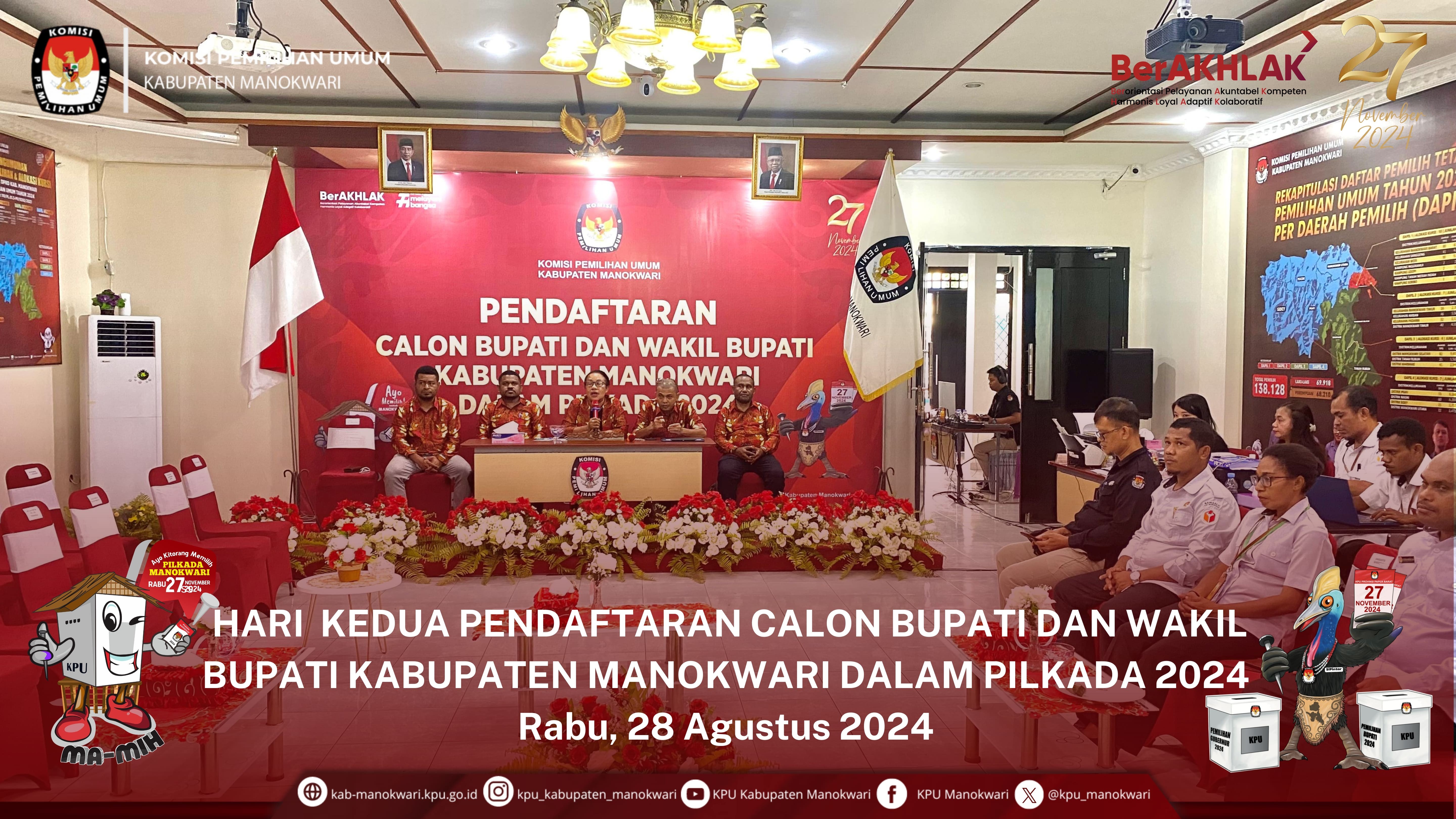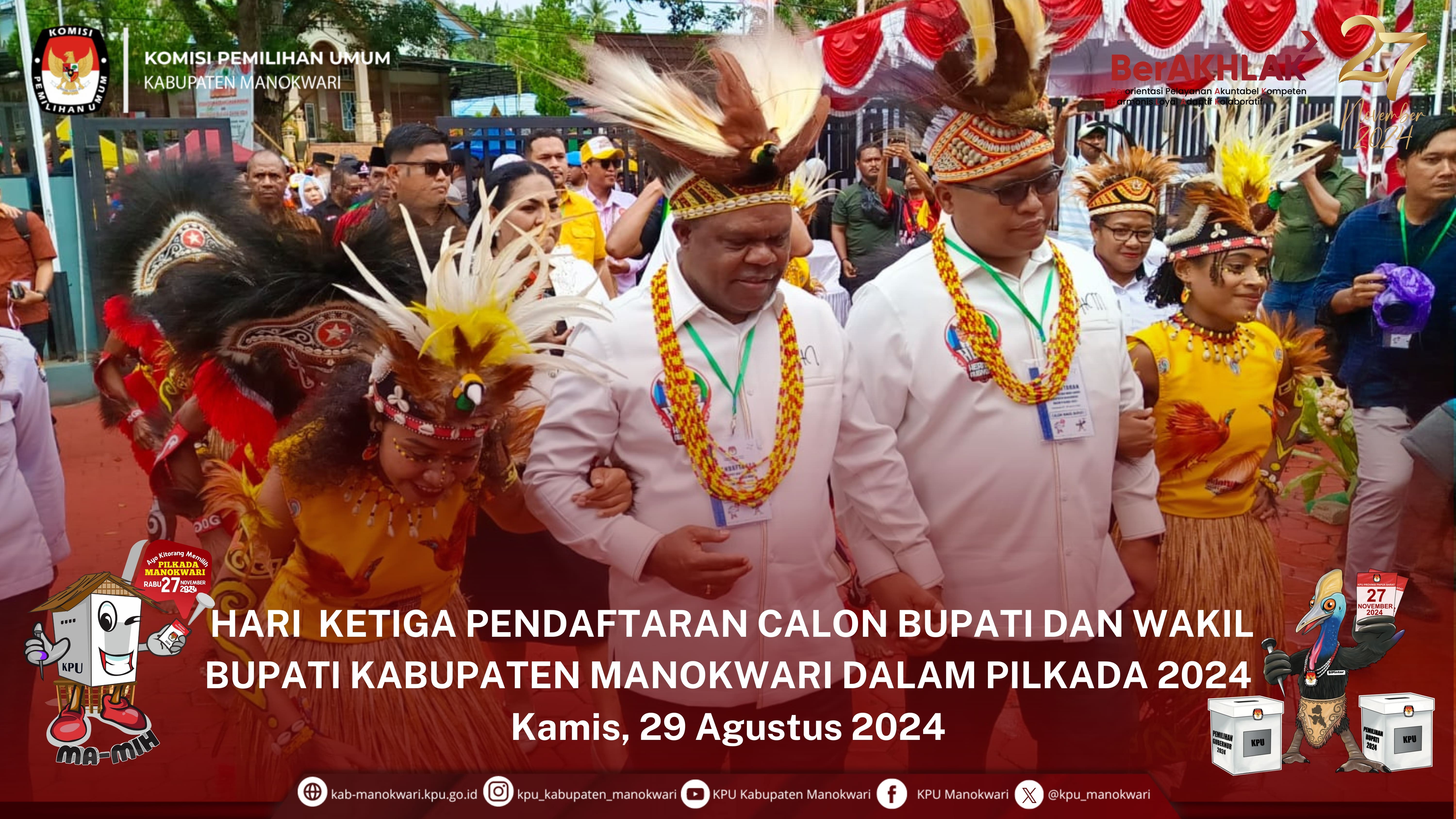 #PaceMace #Temanpemilih, Kamis 29 Agustus 2024, KPU Kab. Manokwari menerima pendaftaran yang pertama dari bakal pasangan calon bupati dan wakil bupati Manokwari Tahun 2024, yakni dari Hermus Indou dan Mugiyono, di aula kantor KPU Kab. Manokwari. Kedatangan pasangan calon tersebut, disambut oleh komisioner serta sekretariat KPU Kab. Manokwari.