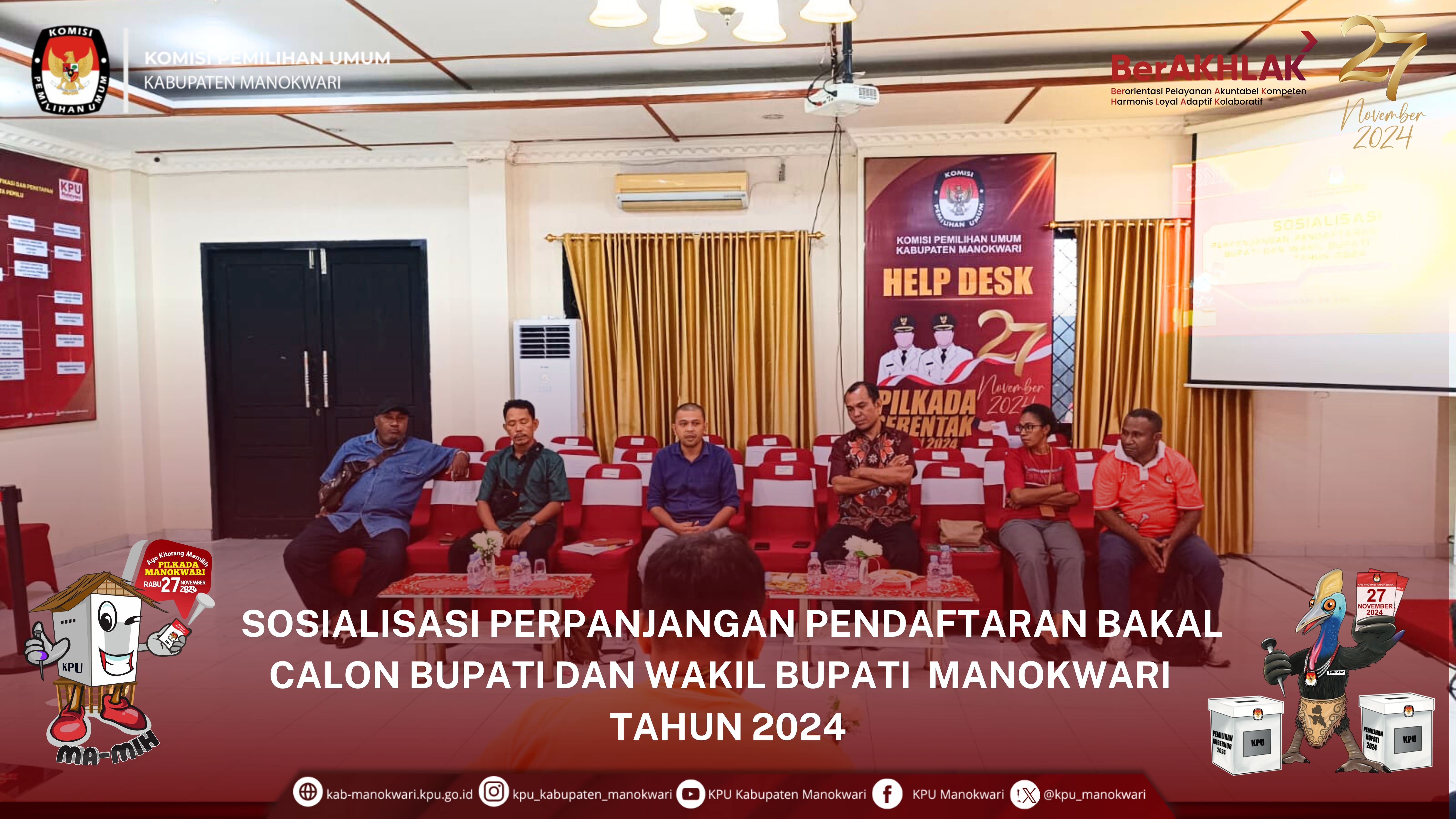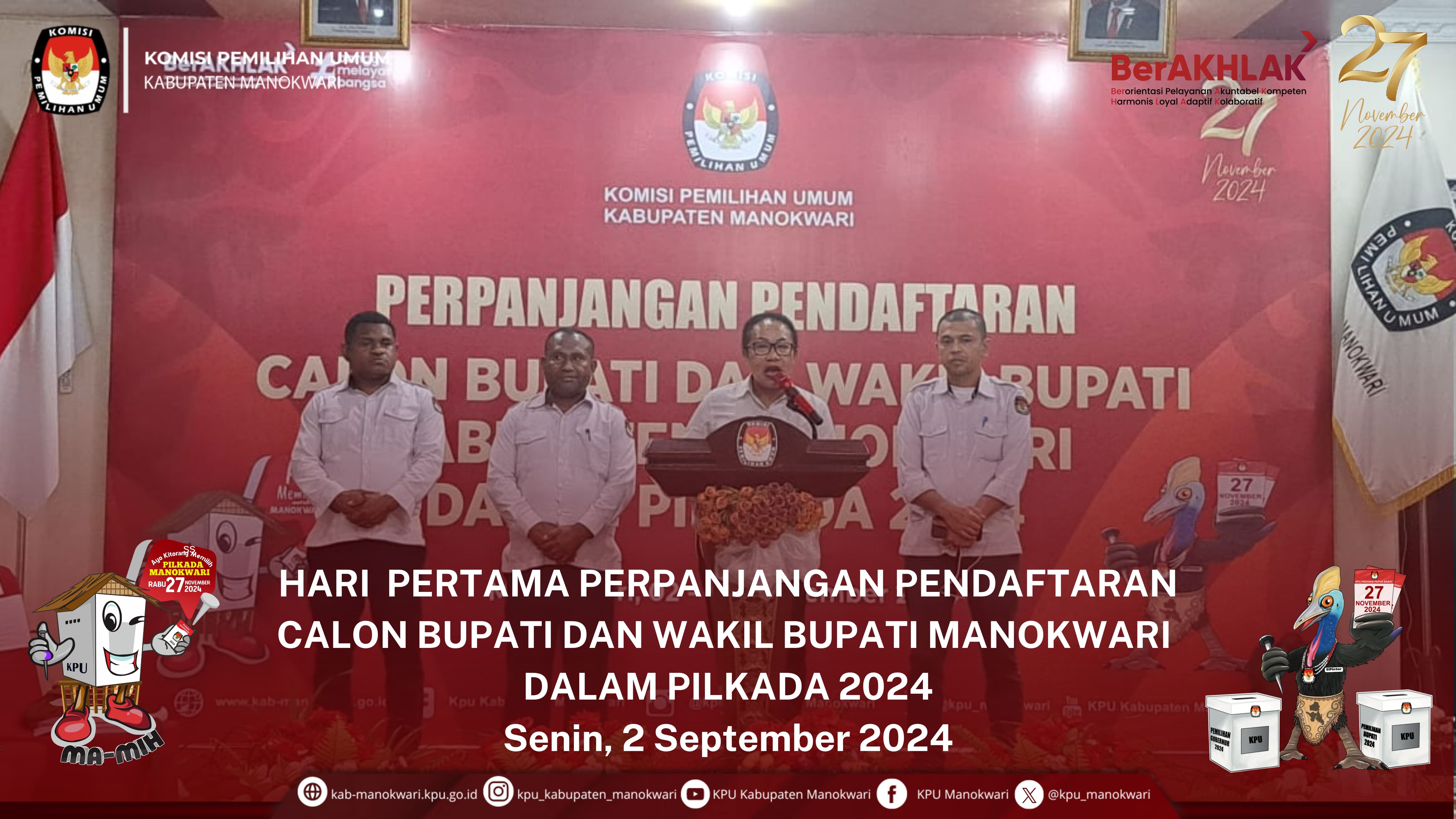 KPU Kab. Manokwari melakukan perpanjangan pendaftaran dikarenakan sampai dengan batas akhir pendaftaran tanggal 29 Agustus 2024 hanya 1 bakal paslon yang mendaftar ke KPU Kab. Manokwari. Merujuk Peraturan KPU Nomor 10 Tahun 2024 Pasal 135 inilah KPU melaksanakan perpanjangan pendaftaran.