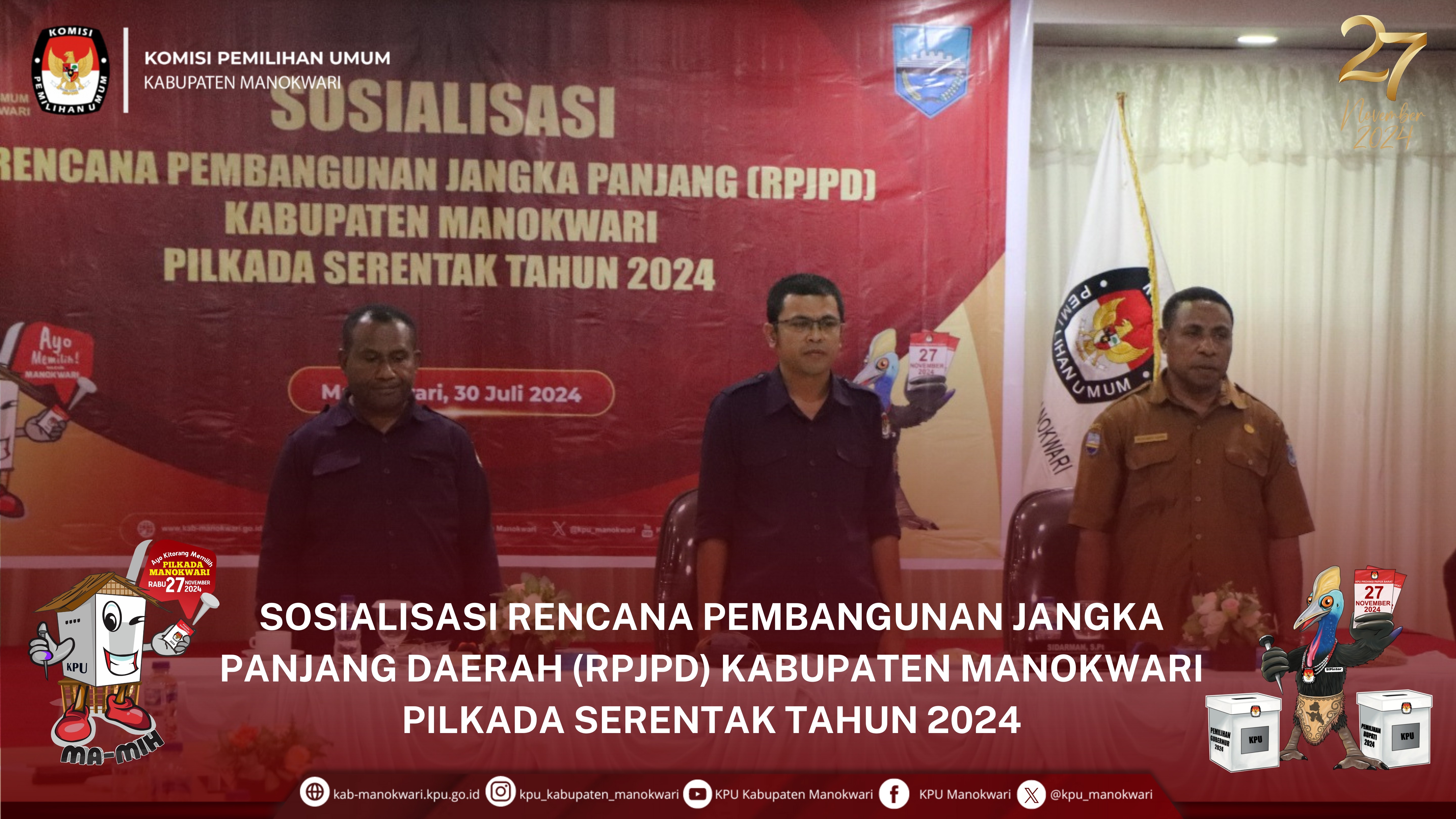 #PaceMace #TemanPemilih, KPU Kab. Manokwari pada Selasa (30/7) melaksanakan Sosialisasi Rencana Pembangunan Jangka Panjang Daerah (RPJPD) bertempat di Mansinam Beach Hotel Manokwari.