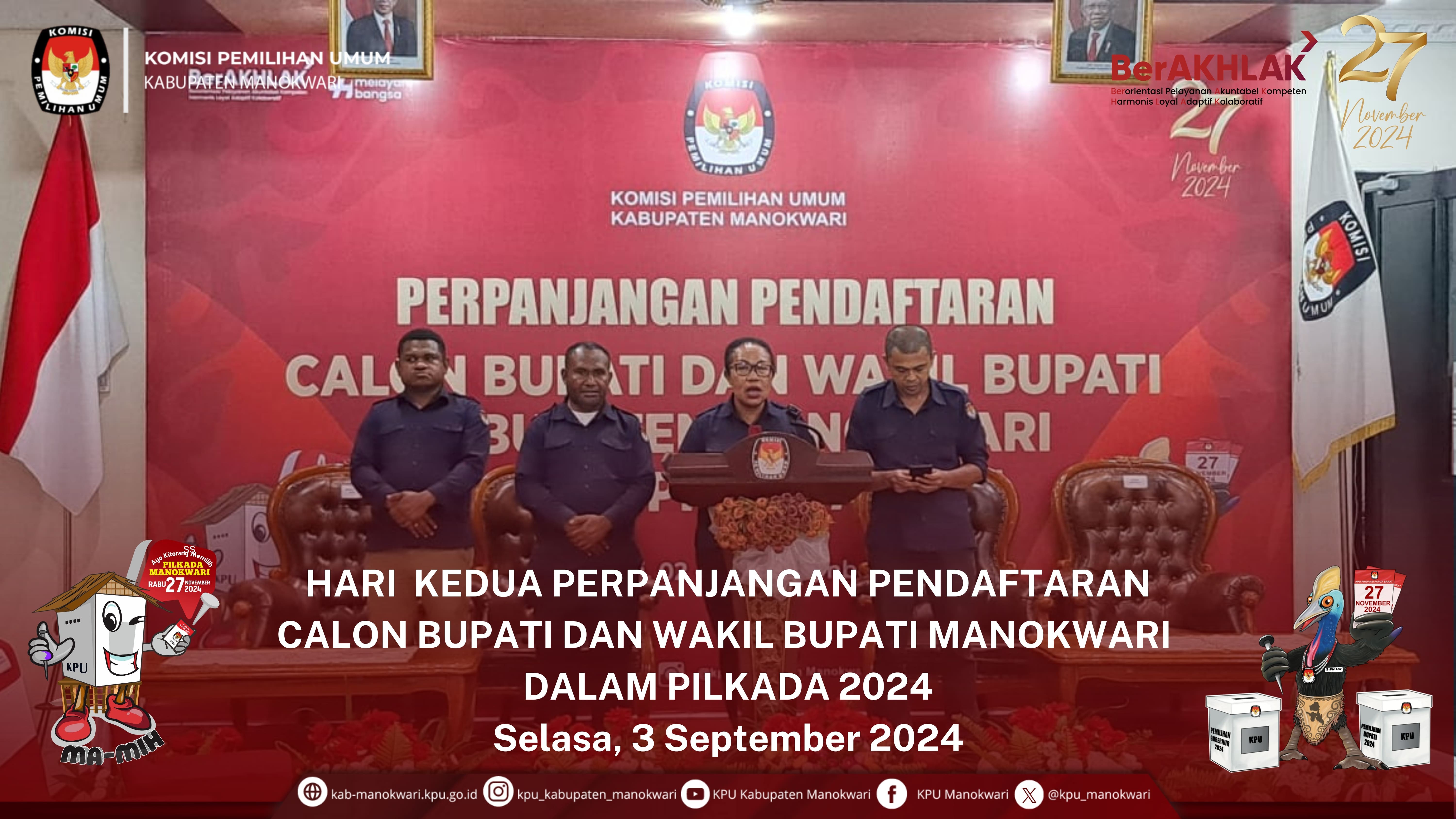 #PaceMace #Temanpemilih, Kamis 29 Agustus 2024, KPU Kab. Manokwari menerima pendaftaran yang pertama dari bakal pasangan calon bupati dan wakil bupati Manokwari Tahun 2024, yakni dari Hermus Indou dan Mugiyono, di aula kantor KPU Kab. Manokwari. Kedatangan pasangan calon tersebut, disambut oleh komisioner serta sekretariat KPU Kab. Manokwari.