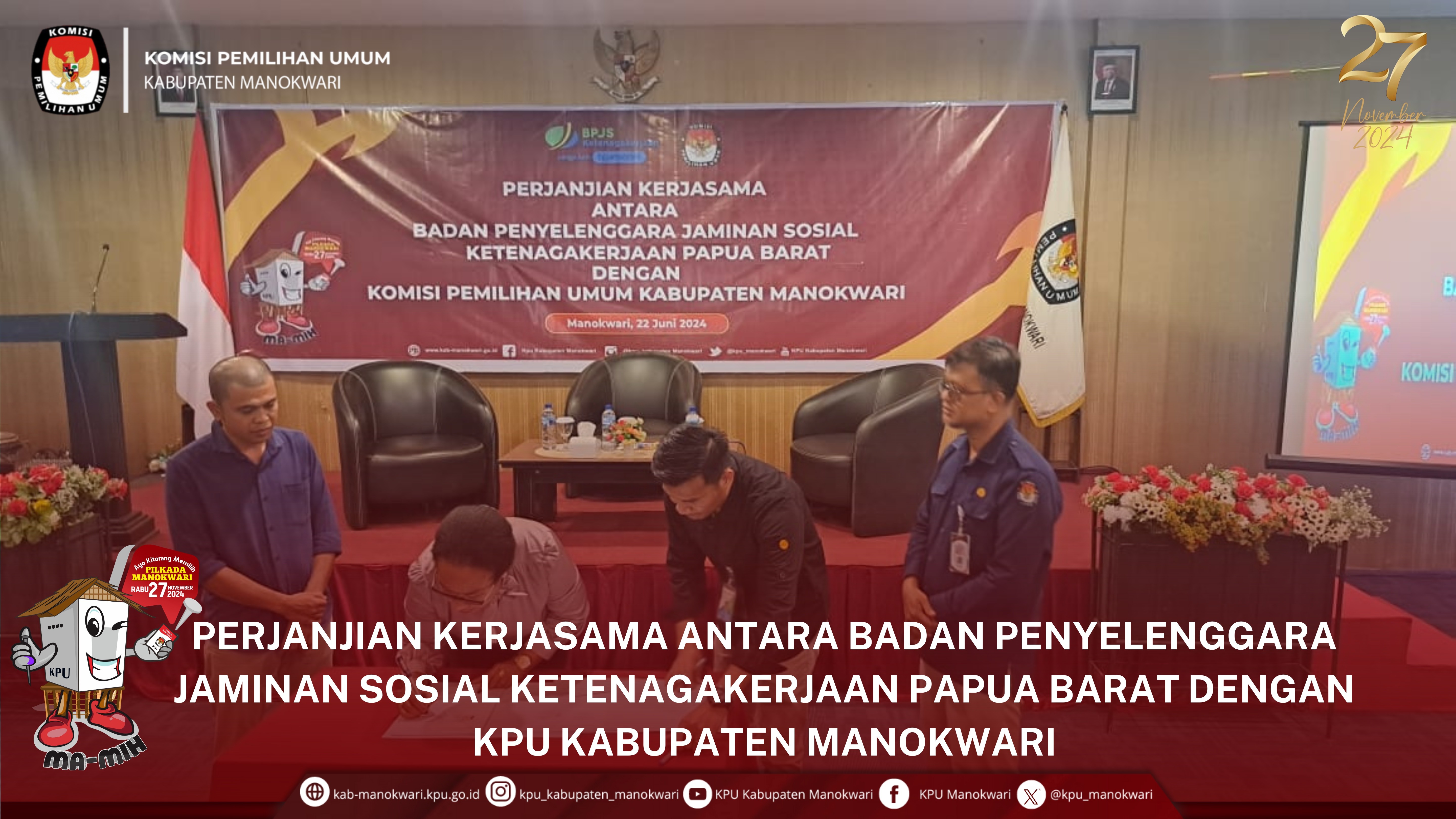 #PaceMace #TemanPemilih, Komisi Pemilihan Umum Kabupaten Manokwari menjalin kerjasama dengan Badan Penyenggara Jaminan Sosial (BPJS) Ketenagakerjaan Cabang Manokwari untuk memastikan jaminan ketenagakerjaan bagi penyelenggara Pemilu atau adhoc di wilayahnya.