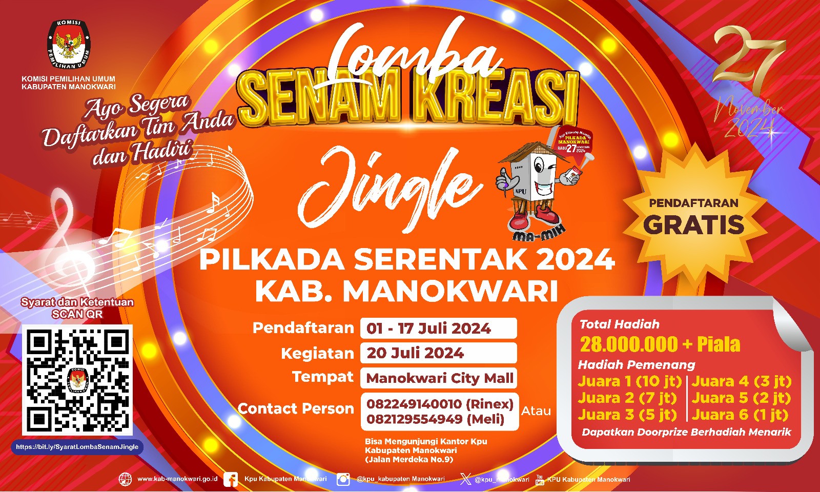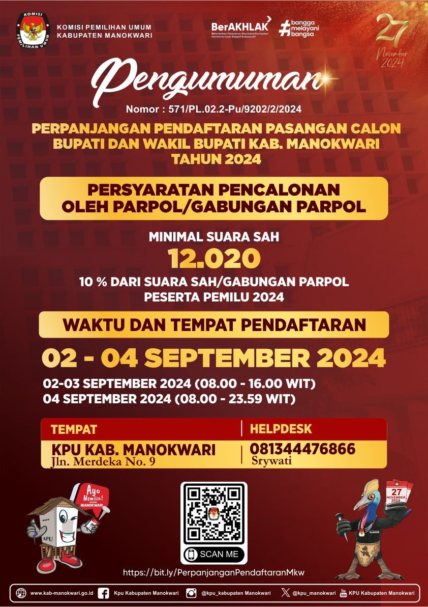Berikut disampaikan Pengumuman Perpanjangan Pendaftaran Pasangan Calon Bupati dan Wakil Bupati Kabupaten Manokwari Tahun 2024. Dapat diunduh di http://bit.ly/PerpanjanganPendaftaranMkw atau klik DISINI