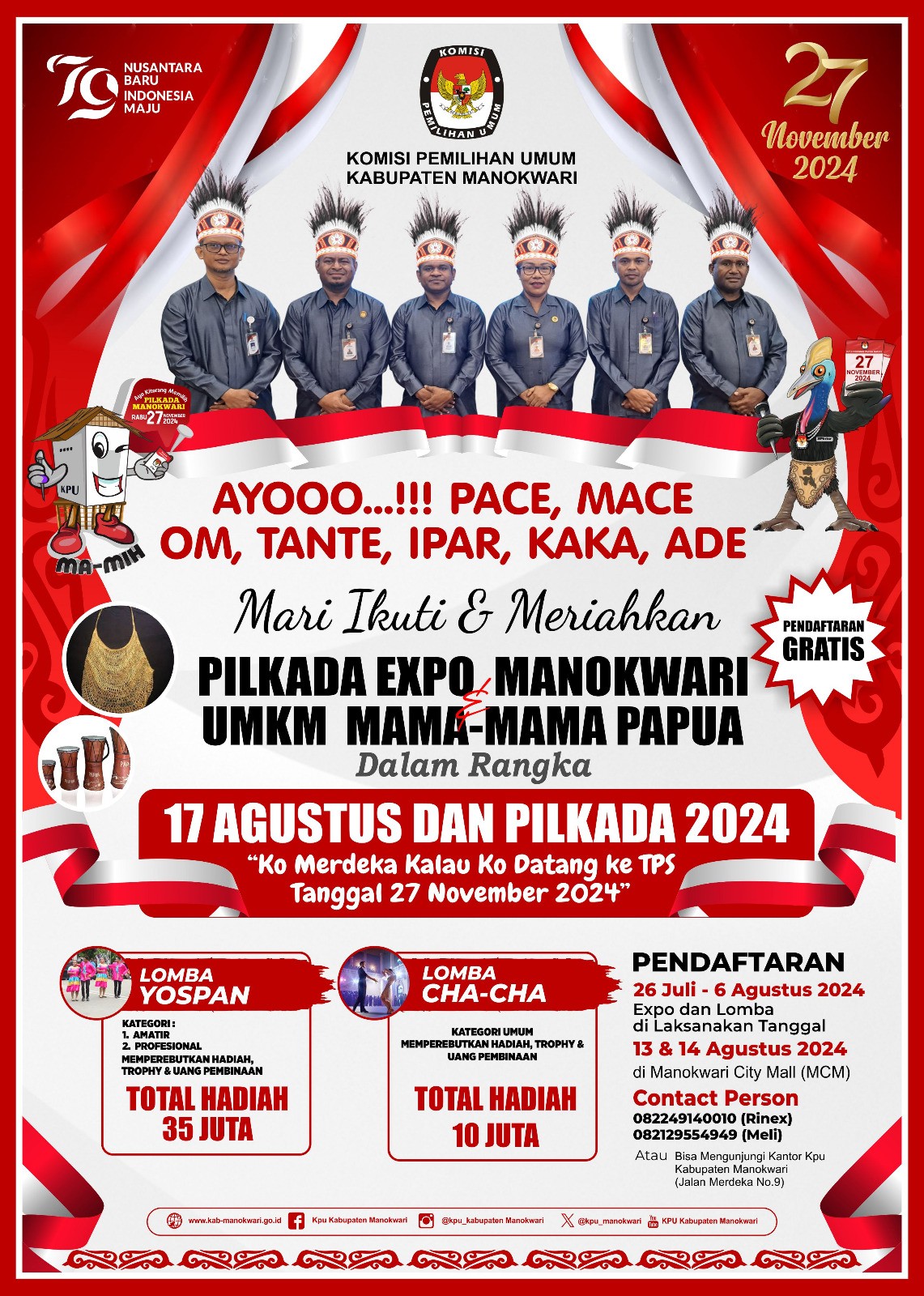 #PaceMace #TemanPemilih, Ayoo warga Manokwari mari ikuti dan meriahkan Pilkada Expo Manokwari dan UMKM Mama-mama Papua dalam Rangka 17 Agustus serta Lomba Yospan dan Lomba Cha-Cha di Manokwari City Mall 13 s.d 14 Agustus 2024.