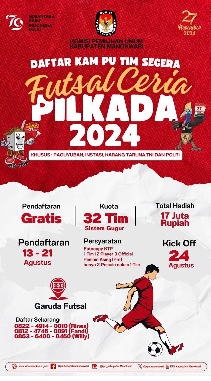 #PaceMace #TemanPemilih, Ayoo daftarkan tim kalian di Futsal Ceria Pilkada 2024 khusus paguyuban, instansi, karang taruna, TNI dan Polri. Pendaftaran gratis. Hubungi contact person yang tersedia...