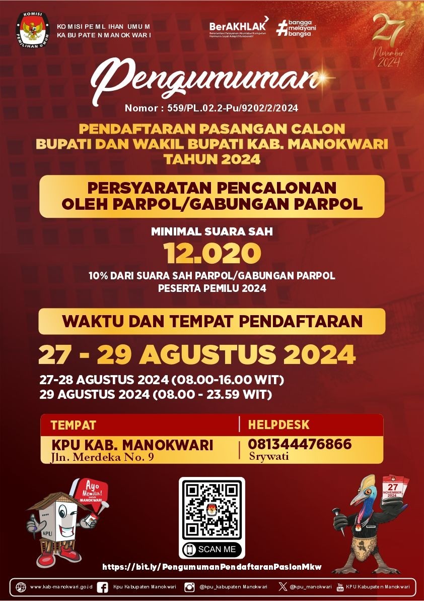 Berikut disampaikan Pengumuman Pendaftaran Pasangan Calon Bupati dan Wakil Bupati Kabupaten Manokwari Tahun 2024. Dapat diunduh di https://bit.ly/PengumumanPendaftaranPaslonMkw atau klik DISINI