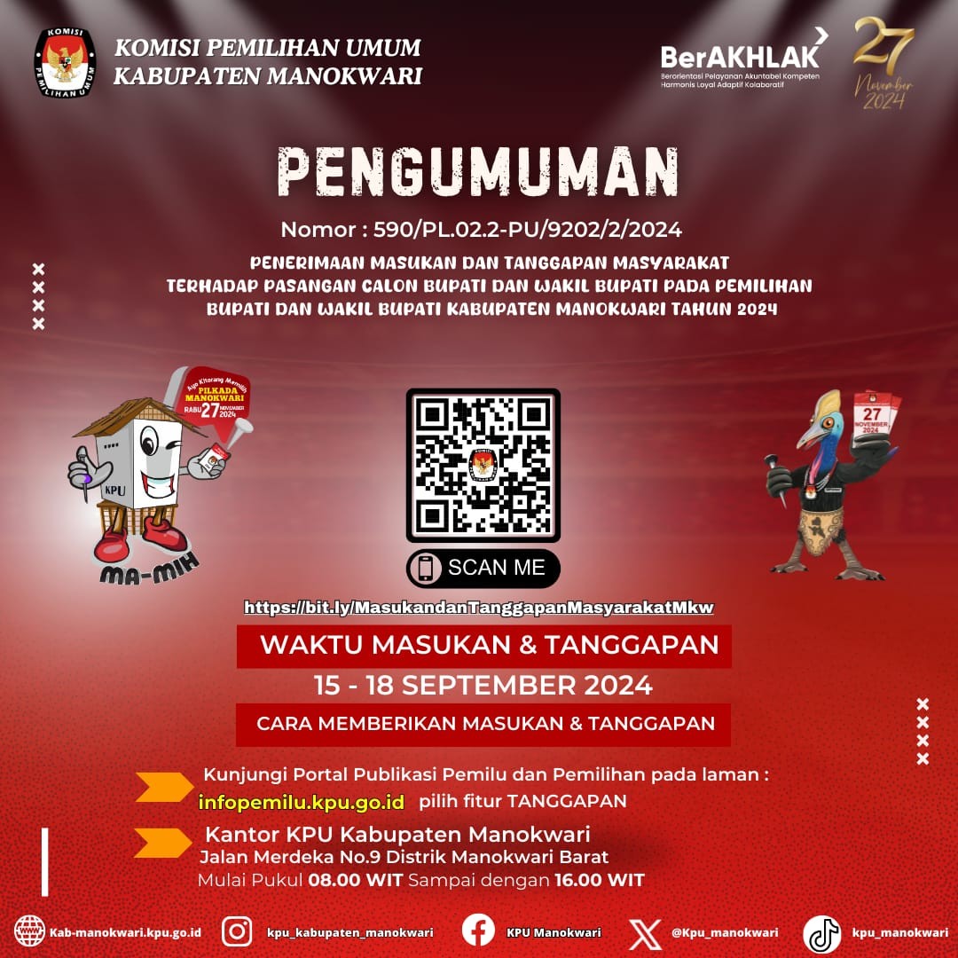 #PaceMace #Temanpemilih, berikut adalah pengumuman penerimaan masukan dan tanggapan masyarakat terhadap paslon Bupati dan Wakil Bupati Manokwari Tahun 2024. Info lebih lanjut silakan kunjungi situs website kami atau klik tautan https://bit.ly/MasukandanTanggapanMkw