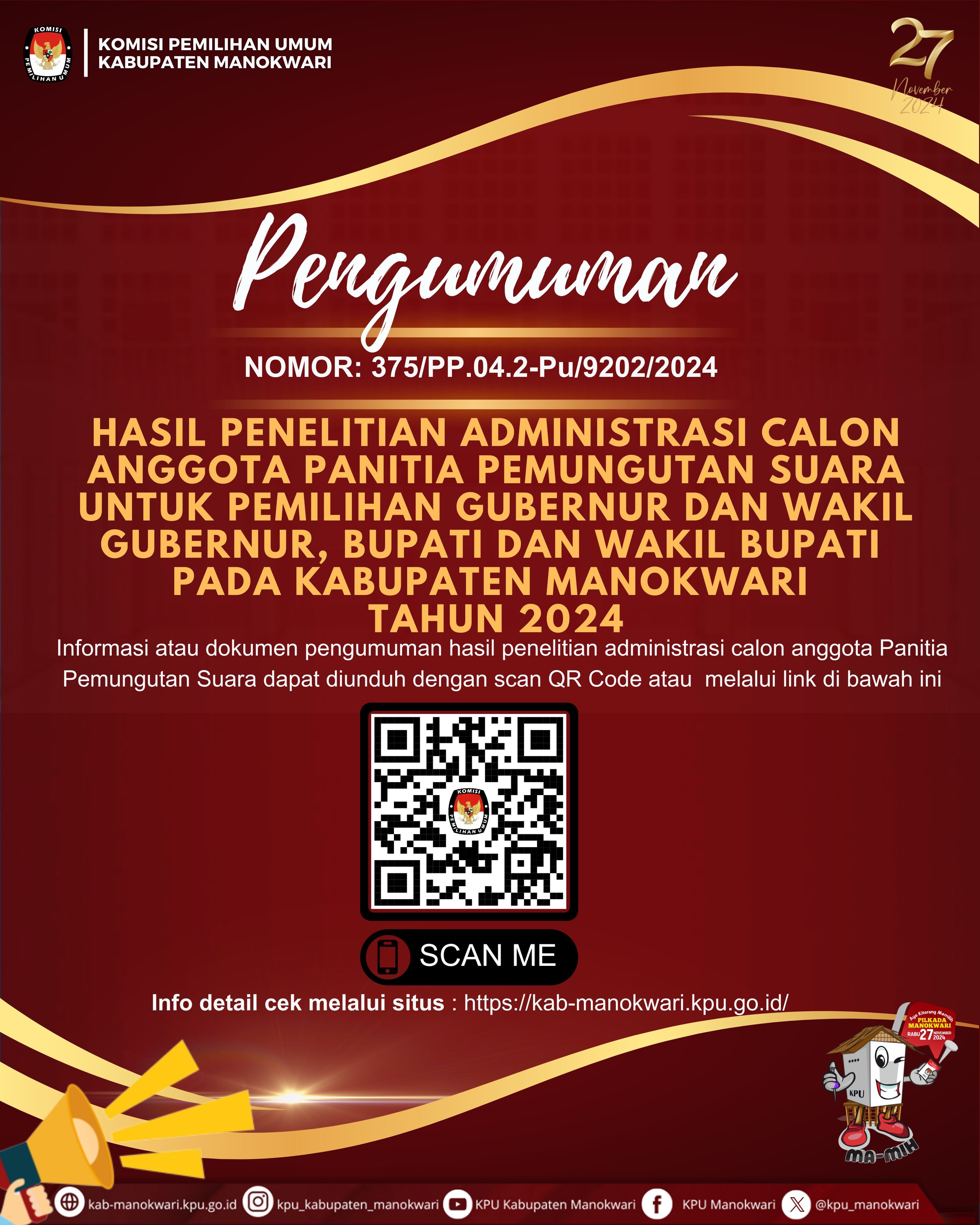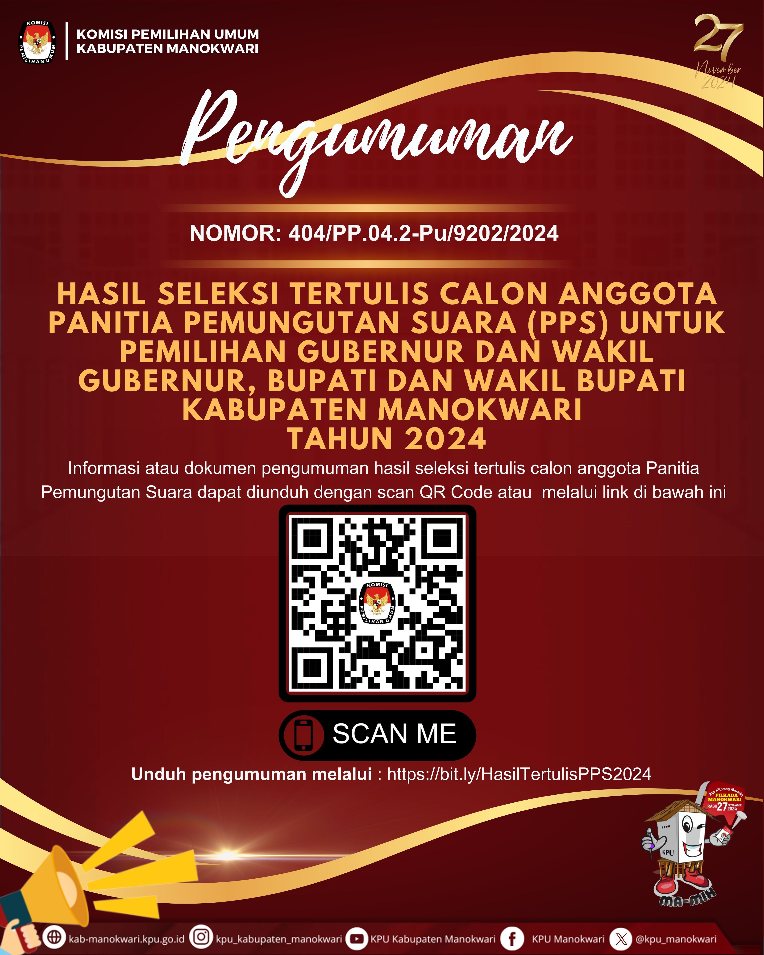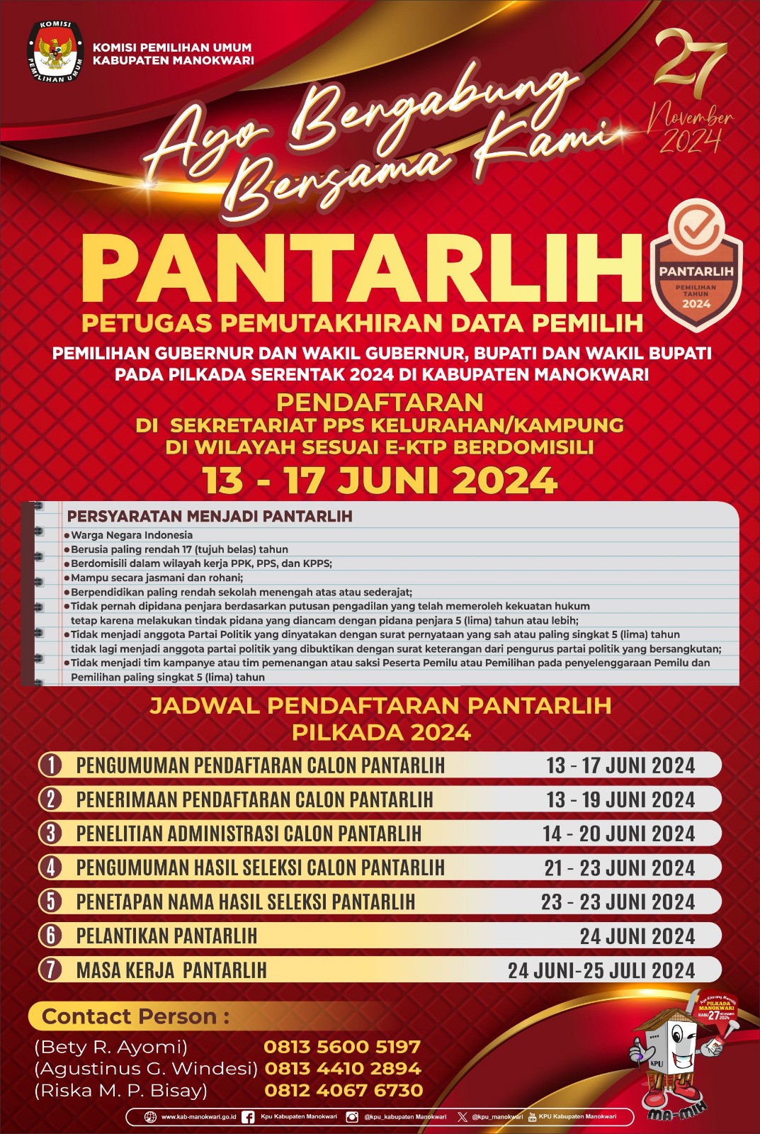 #PaceMace #TemanPemilih, Ayo bergabung bersama kami menjadi Petugas Pemutakhiran Data Pemilih (Pantarlih) Pilkada serentak tahun 2024. Penerimaan Pendaftaran dimulai dari 13 s.d 19 Juni 2024. Pendaftaran di Sekretariat PPS Kelurahan/Kampung di wilayah sesuai e-KTP berdomisili. Syarat & ketentuan dapat dilihat pada gambar berikut.