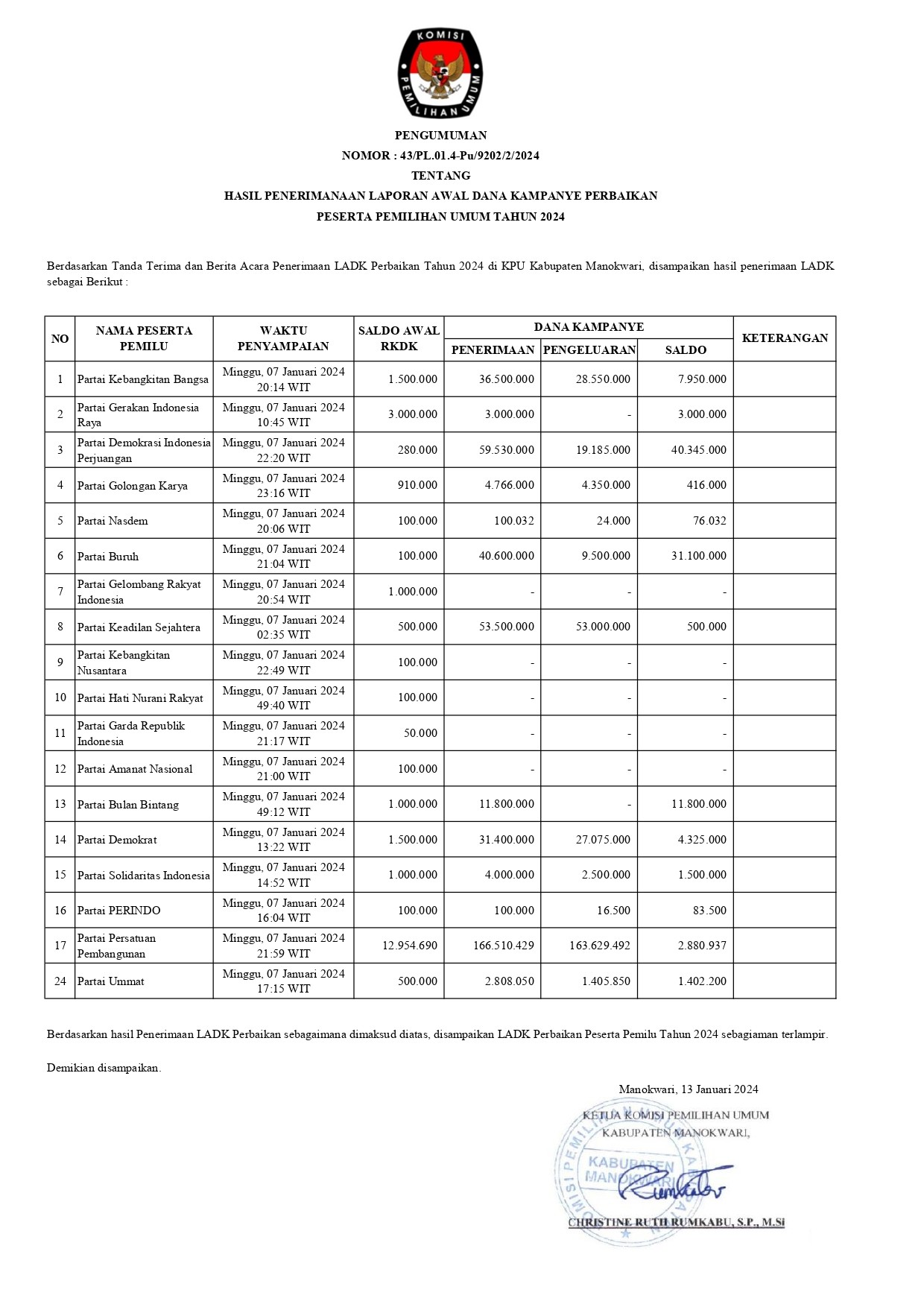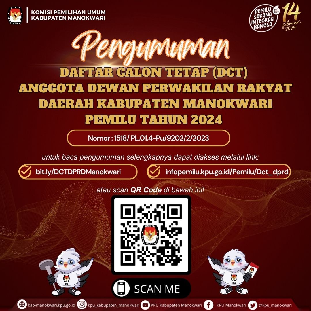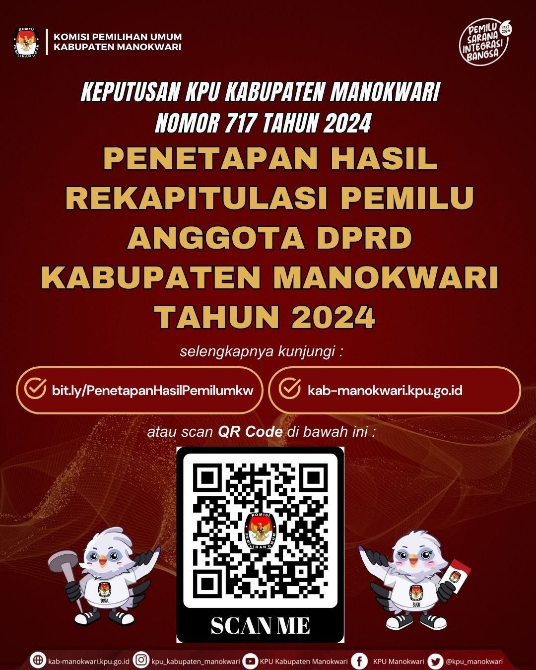 KPU Kab. Manokwari pada Senin s.d Selasa (4-5 Maret 2024) telah melaksanakan Rapat Pleno Rekapitulasi Hasil Penghitungan Perolehan Suara dan Penetapan Hasil Pemilu Tahun 2024. Berdasarkan berita acara dan sertifikat rekapitulasi hasil penghitungan perolehan suara partai politik dan calon anggota DPRD Kabupaten/Kota dari kecamatan dalam wilayah Kabupaten/Kota Pemilu Tahun 2024, KPU Kab. Manokwari menetapkan hasil Pemilu Anggota DPRD Kab. Manokwari Tahun 2024 sebagai berikut: klik di sini
