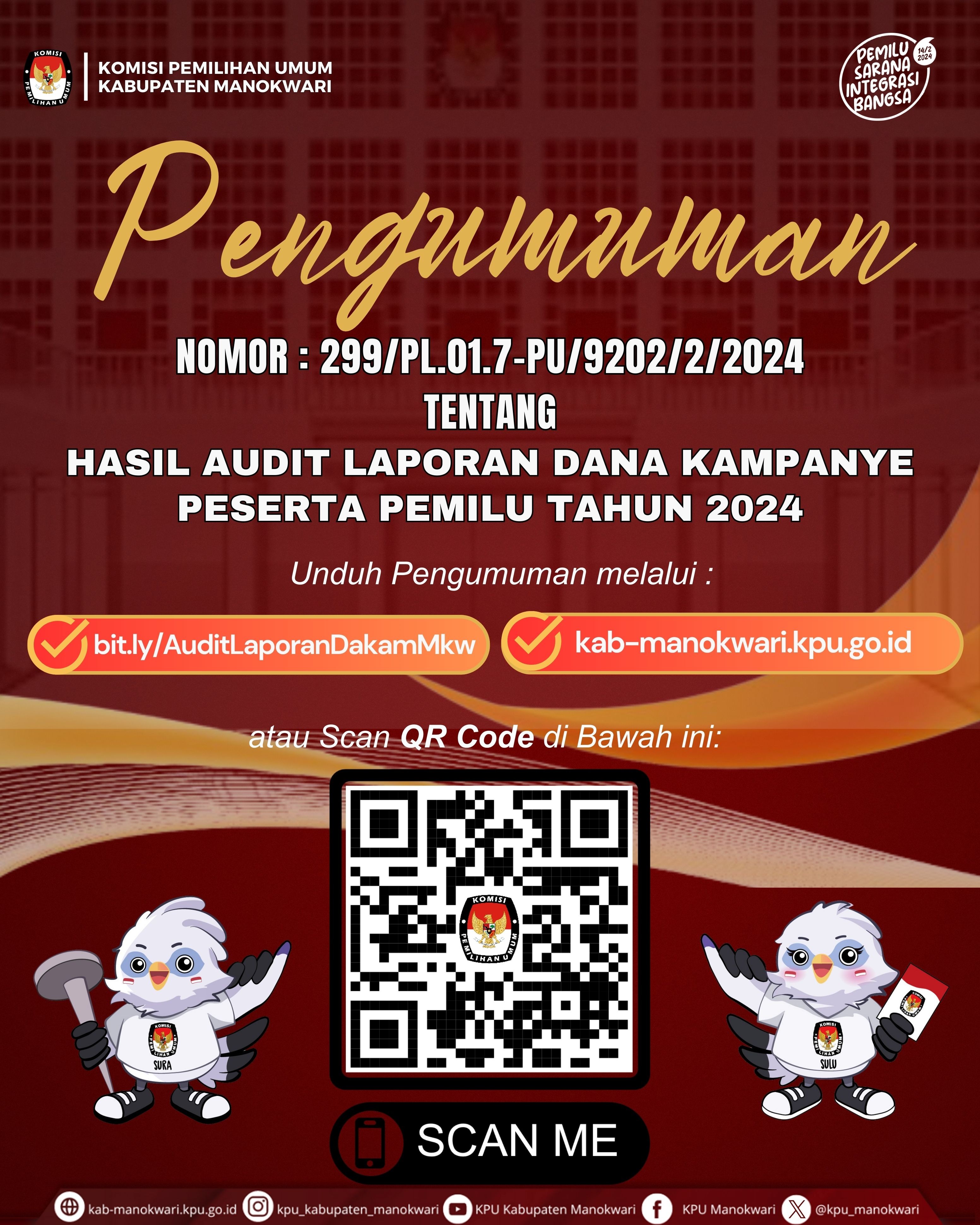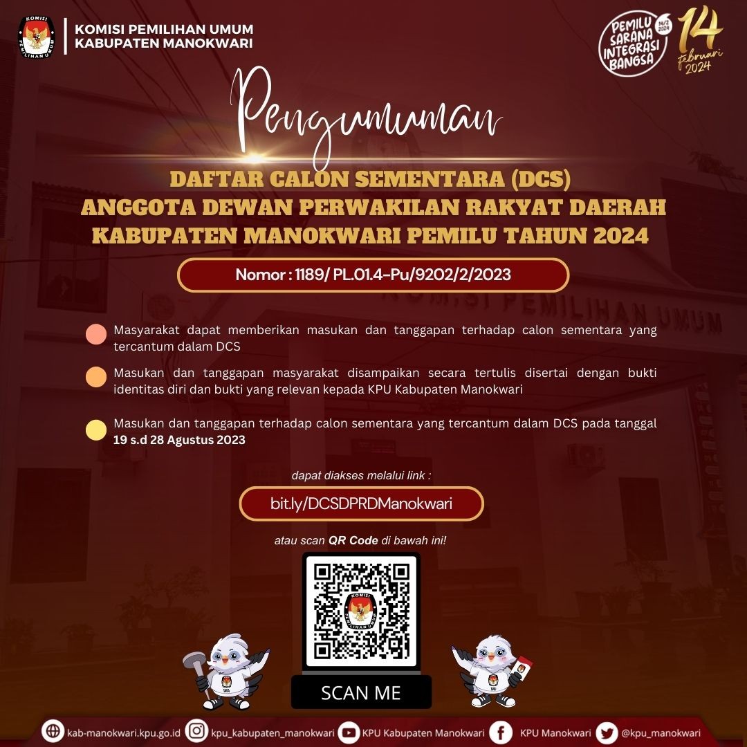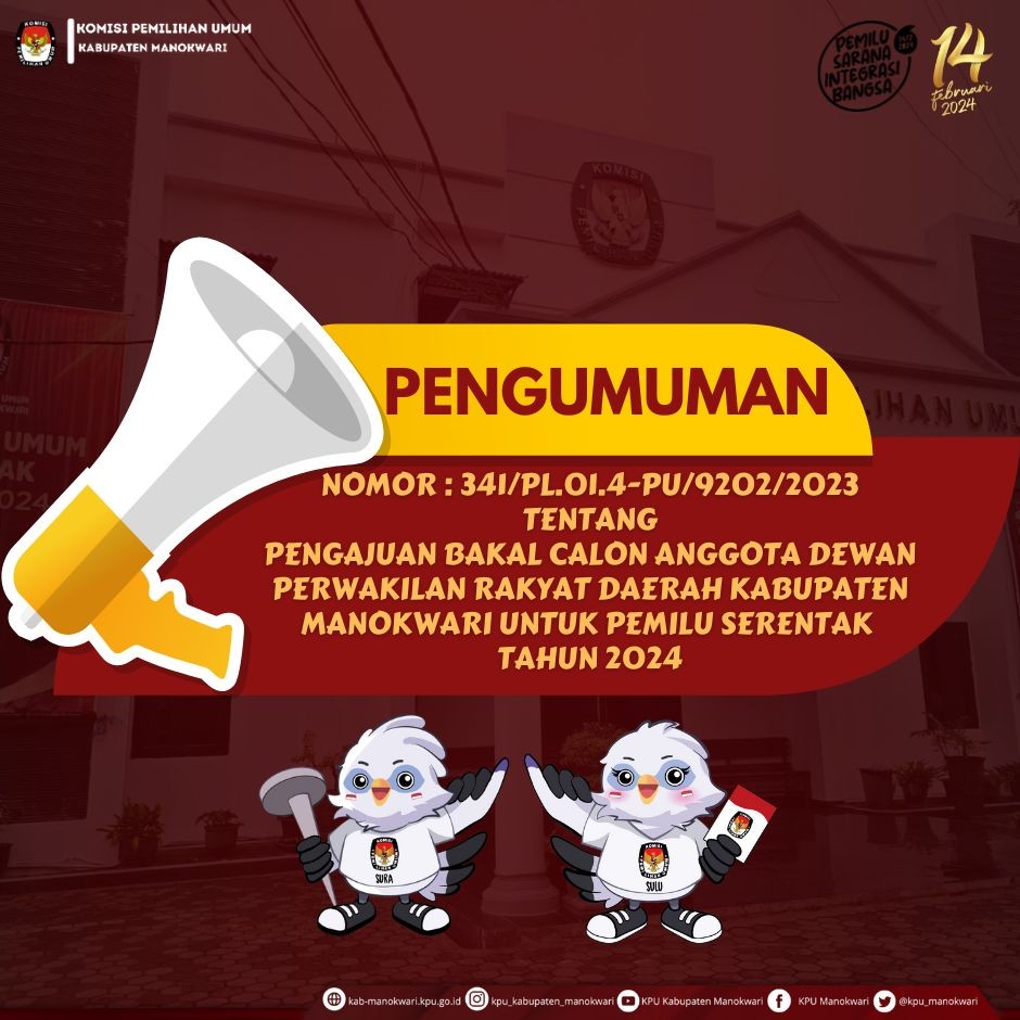 KPU Kab. Manokwari pada Senin s.d Selasa (4-5 Maret 2024) telah melaksanakan Rapat Pleno Rekapitulasi Hasil Penghitungan Perolehan Suara dan Penetapan Hasil Pemilu Tahun 2024. Berdasarkan berita acara dan sertifikat rekapitulasi hasil penghitungan perolehan suara partai politik dan calon anggota DPRD Kabupaten/Kota dari kecamatan dalam wilayah Kabupaten/Kota Pemilu Tahun 2024, KPU Kab. Manokwari menetapkan hasil Pemilu Anggota DPRD Kab. Manokwari Tahun 2024 sebagai berikut: klik di sini